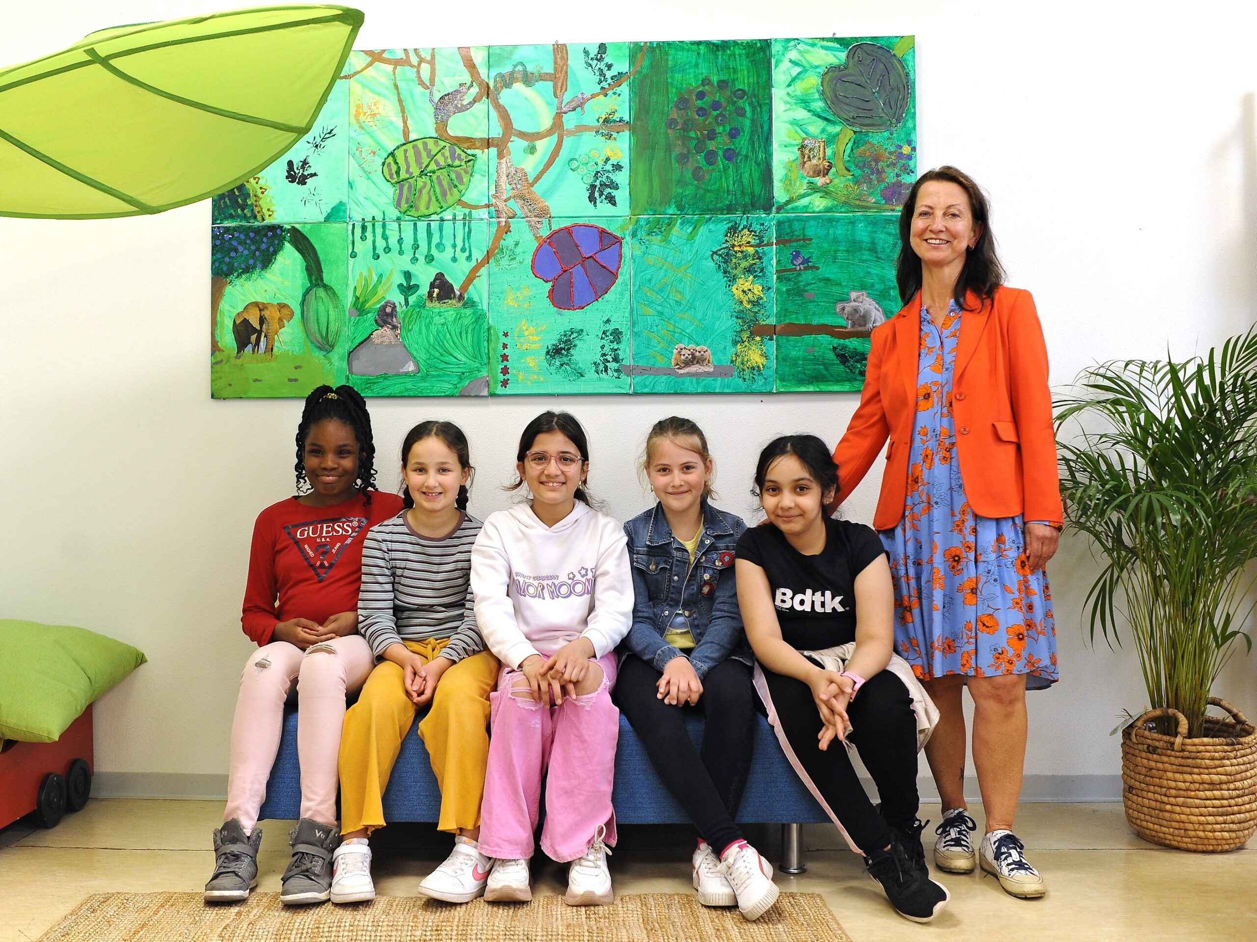 Zusammen mit der Künstlerin Birgit Gill haben Kinder des OGS der Paulschule ein Acrylbild kreiert. Entstanden ist ein Kunstwerk mit Motiven von exotischen Tieren und Pflanzen. Im Rahmen einer kleinen Feierstunde wurde das Gemälde dem Leseclub übergeben.