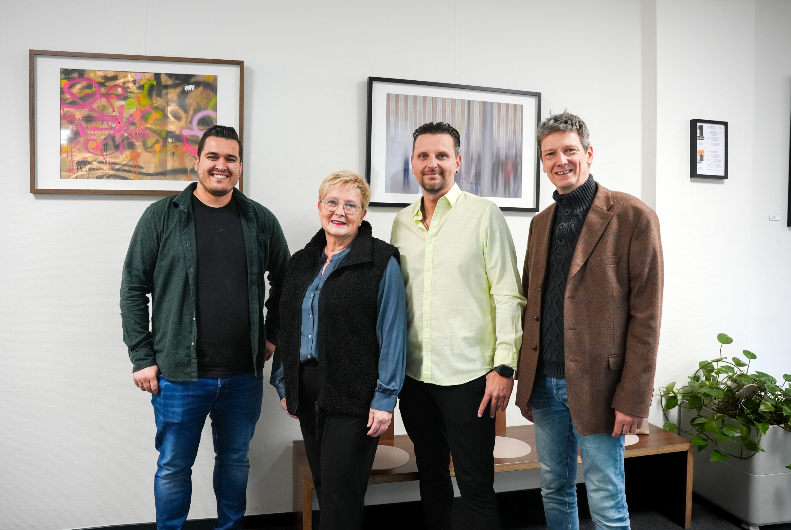 Gemeinsam für die Kunst: Nolin Wischermann, Bürgermeisterin Monika Budke, Lennart Leipski (Abteilungsleiter des Bürgerbüros) & Stephan Hütte. (v.l.n.r.)