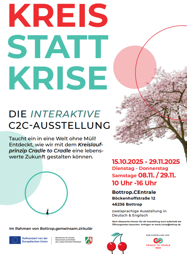 Bottrop zeigt, wie Zukunft geht: Vom 15. Oktober bis 28. November 2025 lädt die Ausstellung „Kreis statt Krise“ in die Bottrop.CEntrale in der Böckenhoffstraße 12, 46236 Bottrop ein. Besucherinnen und Besucher erwartet eine Entdeckungsreise in die Welt des Cradle to Cradle-Prinzips – und damit in eine Zukunft, in der kein Produkt mehr zu Müll wird.