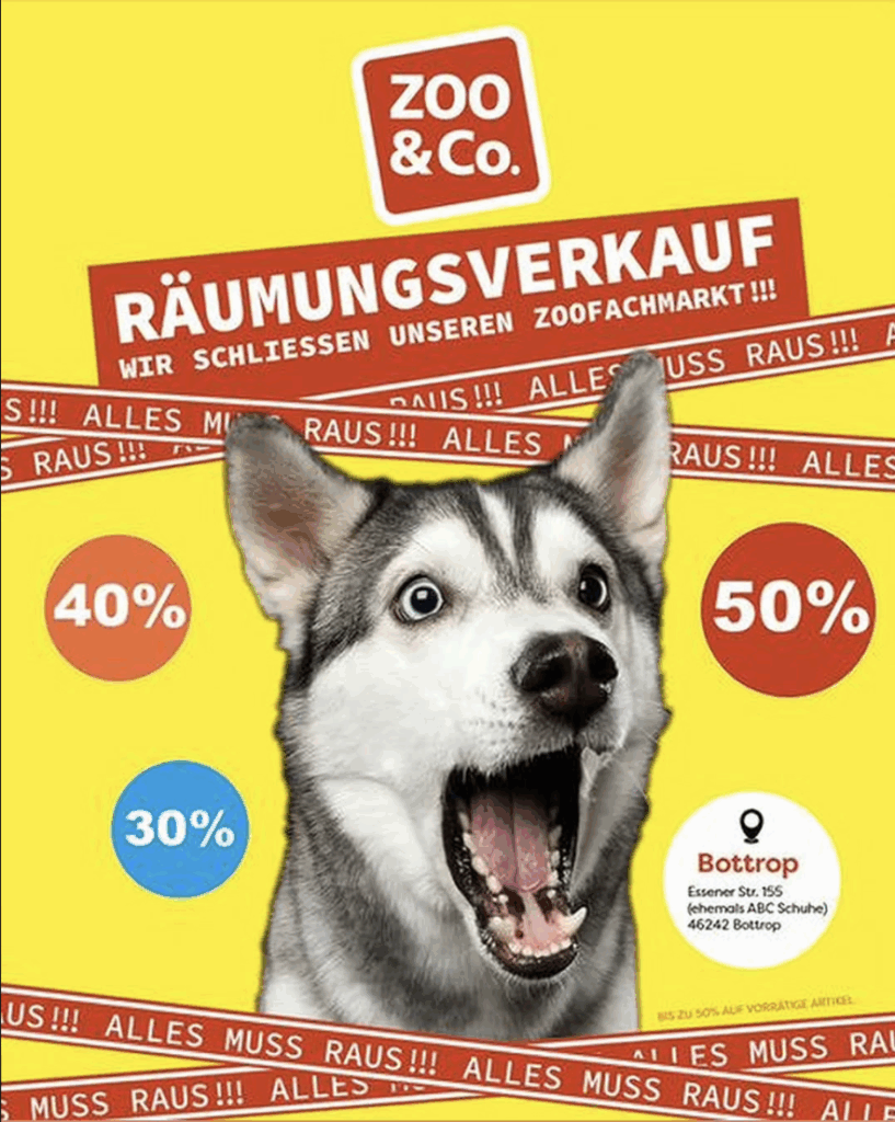 Wie die Zoofachmarkt Essen GmbH über die Sozialen Netzwerke mitteilt, wird die Filiale des Tierfutter-Geschäfts an der Essener Straße in Bottrop wohl geschlossen. “Alles muss raus”, heißt es im Posting, das am Samstagvormittag, 16. November, auf Instagram (“@zoo_und_co_bottrop“) veröffentlicht worden ist.