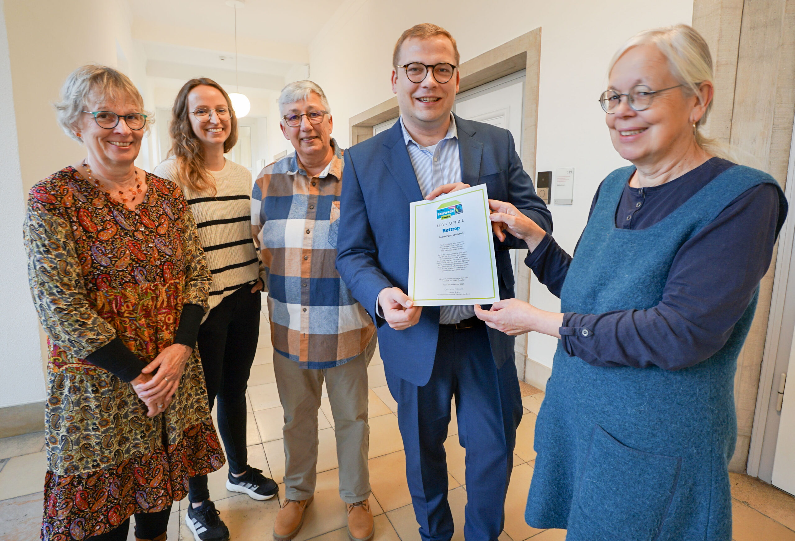Anke Büker-Mamy (v.r.) überreicht das Fairtrade-Zertifikat an Oberbürgermeister Matthias Buschfeld. Zur Steuerungsgruppe gehören Nora Schrage-Schmücker, Corinna Bauer und Birgit Offert.