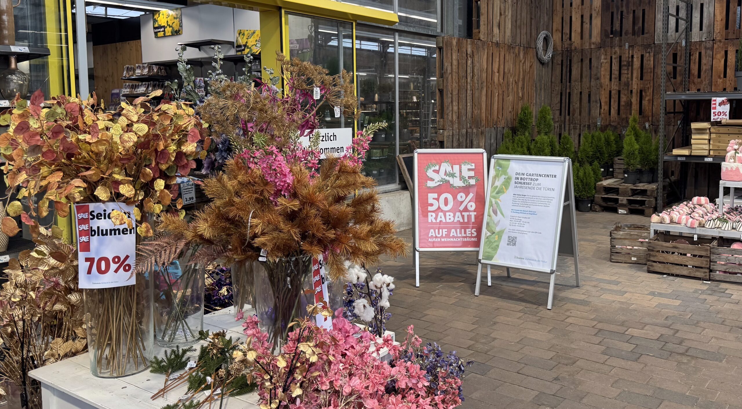 Seit Jahren war Hoeren den Bottropern und Gladbeckern eine Anlaufstelle für Gartenbedarf, Pflanzen, Wohnideen – mit einer großen Produktvielfalt. Inzwischen ist das Sortiment deutlich geschrumpft – auch, weil der Abverkauf bereits läuft. Wer mächtig sparen möchte, erhält derzeit 70% (Stand 15.12) auf alles, außer Weihnachtsbäume. Einige Produkte aus den Bereichen Gartenmöbel, Blumenkübeln, Dekoration, Weihnachtskugeln und mehr sollen noch verfügbar sein.