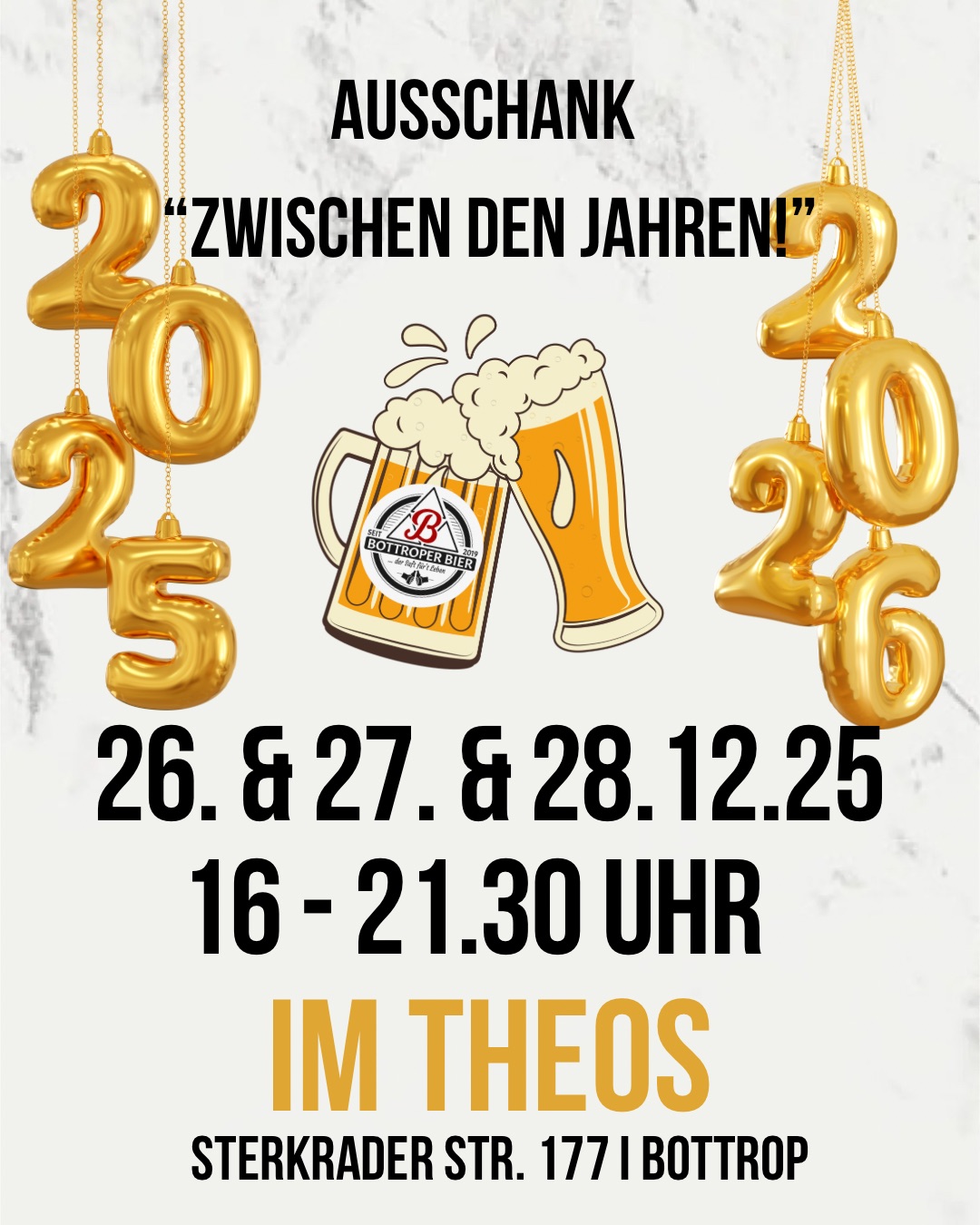 Zwischen den Jahren lädt Bottroper Bier zum Sonderausschank „zwischen den Jahren“ ein. An mehreren Tagen wird im THEOS ausgeschenkt – sogar schon ab 16:00 Uhr, also eine Stunde früher als gewohnt. Eine schöne Gelegenheit, das Jahr gemeinsam ausklingen zu lassen, anzustoßen und sich wiederzusehen.