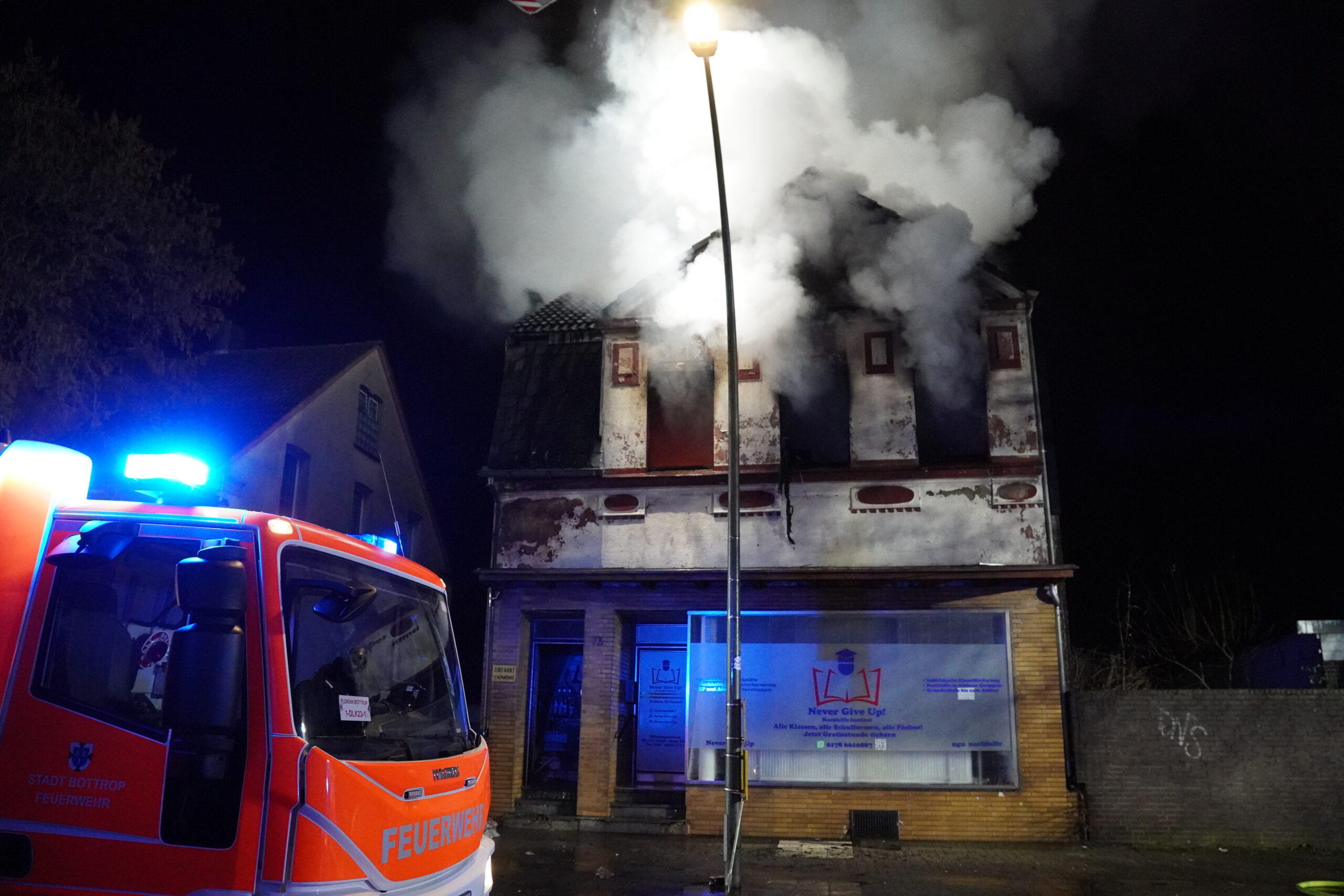 Am Abend des 30. Dezember 2025 wurde die Feuerwehr Bottrop um 21.39 Uhr zu einem Brand in einem Mehrfamilienhaus in Bottrop alarmiert. Beim Eintreffen der Einsatzkräfte standen sowohl eine Wohnung als auch der Dachstuhl des Gebäudes in Vollbrand.