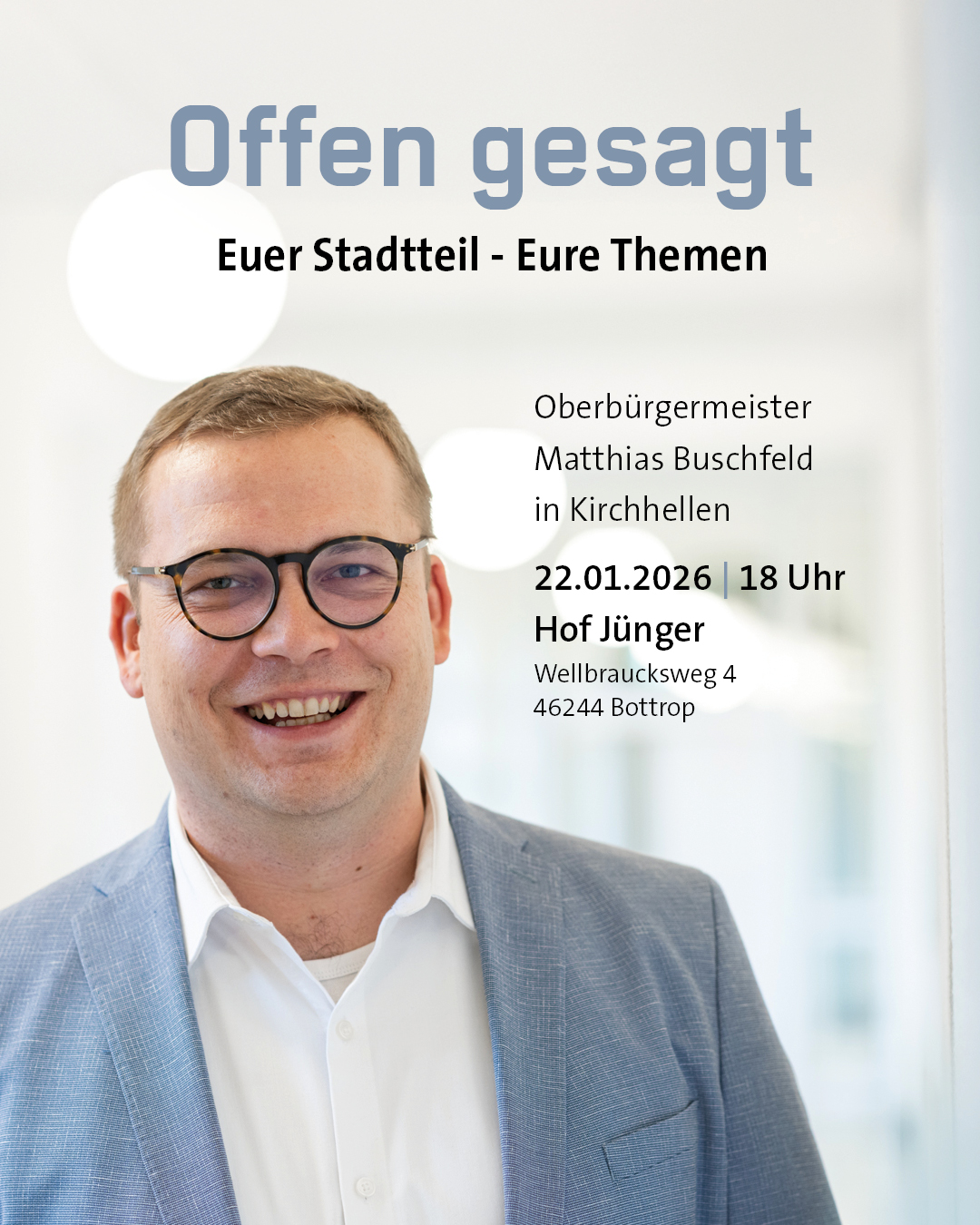 Die neue Gesprächsreihe “Offen gesagt. Euer Stadtteil. Eure Themen.” geht in die nächste Runde. Das aktive Austauschformat findet in allen Bottroper Stadtteilen statt und löst die bisherigen Sprechstunden für BürgerInnen im Rathaus ab. Oberbürgermeister Matthias Buschfeld lädt alle Bottroperinnen und Bottroper ein, ihre Anliegen und Themen direkt einzubringen.