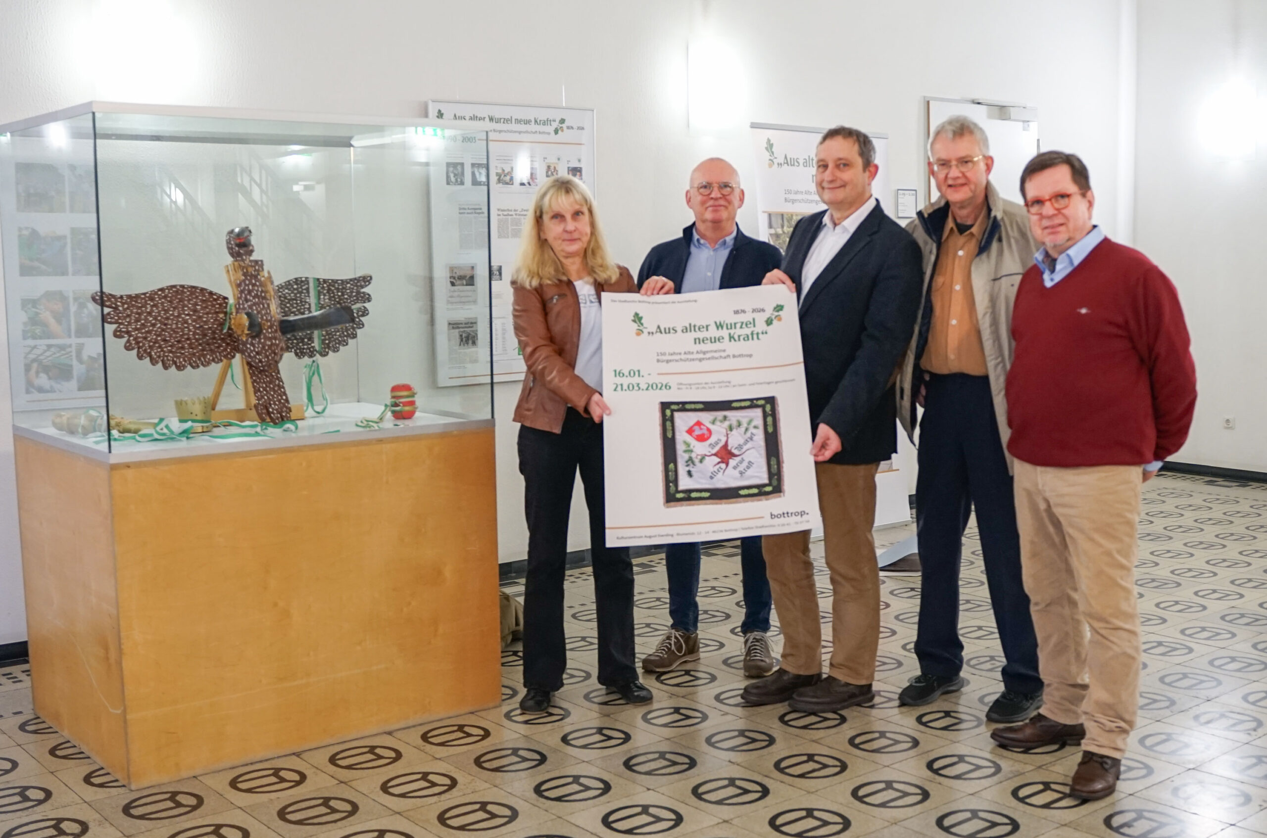 Heike Biskup (v.l.), Patrick Thelen, Ralf Schönberger, Andreas Pläsken und Christoph Freitag haben die Ausstellung zum Jubiläum der Alten Allgemeinen Bürgerschützengesellschaft zusammengestellt.