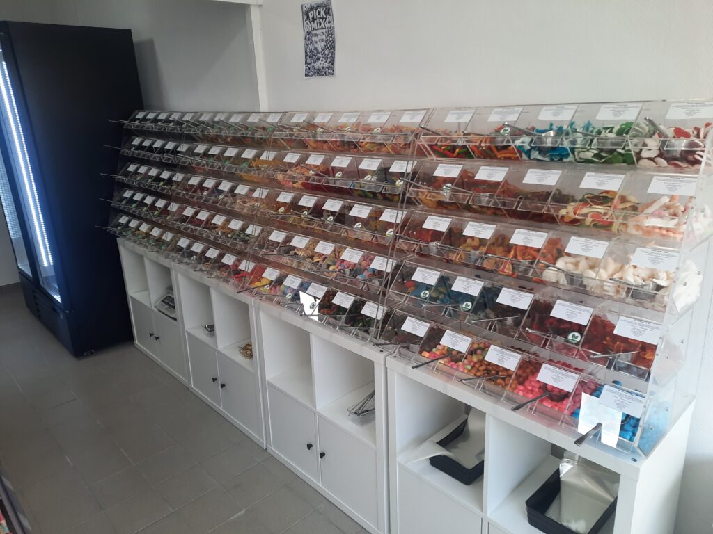 Entlang einer ganzen Wand können Kundinnen und Kunden außerdem aus rund 100 verschiedenen losen Süßigkeiten ihre eigene Mischung zusammenstellen. Dabei wurde bewusst auf Vielfalt geachtet: Von veganen, vegetarischen, halal- oder zuckerfreien Varianten bis hin zu Lakritz ist für viele Geschmäcker etwas dabei.