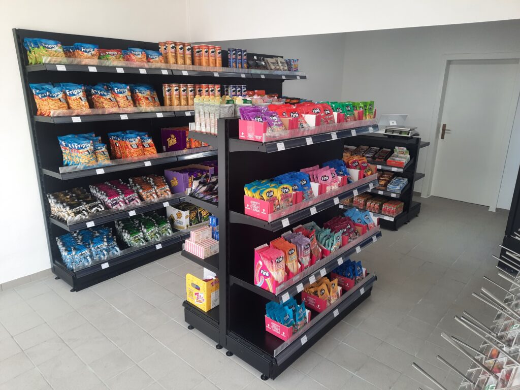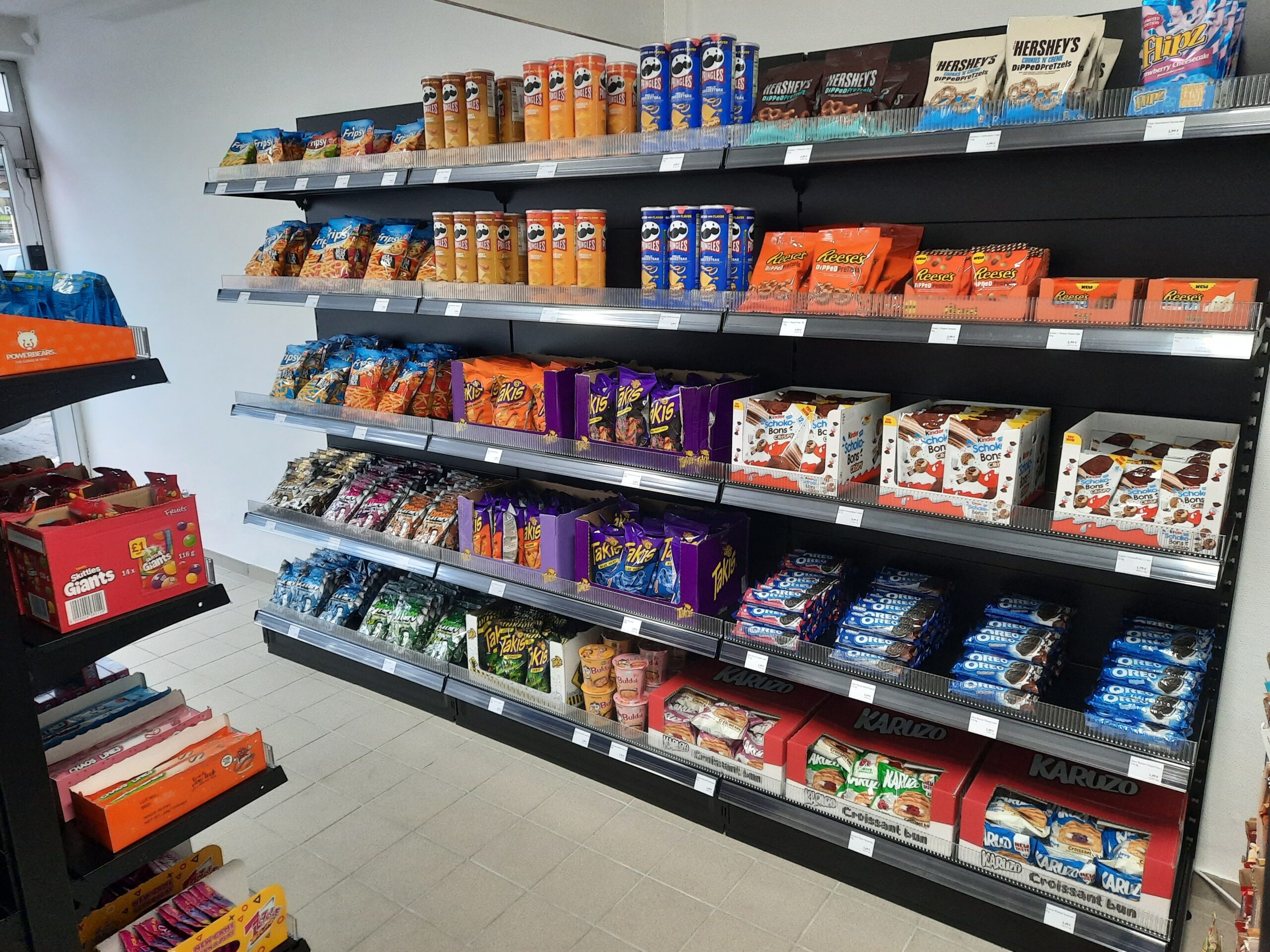 Im Sortiment finden sich Importprodukte bekannter Marken wie Pringles, Fripsy, Sour Patch oder Fini, aber auch beliebte Klassiker wie Takis in verschiedenen Varianten oder spezielle Kinder-Produkte wie Schoko Bons Crispy und Kinder Creamy. Für den kleinen Hunger zwischendurch stehen zudem bekannte Riegel wie KitKat, Mars, Snickers oder Lion an der Kasse bereit.