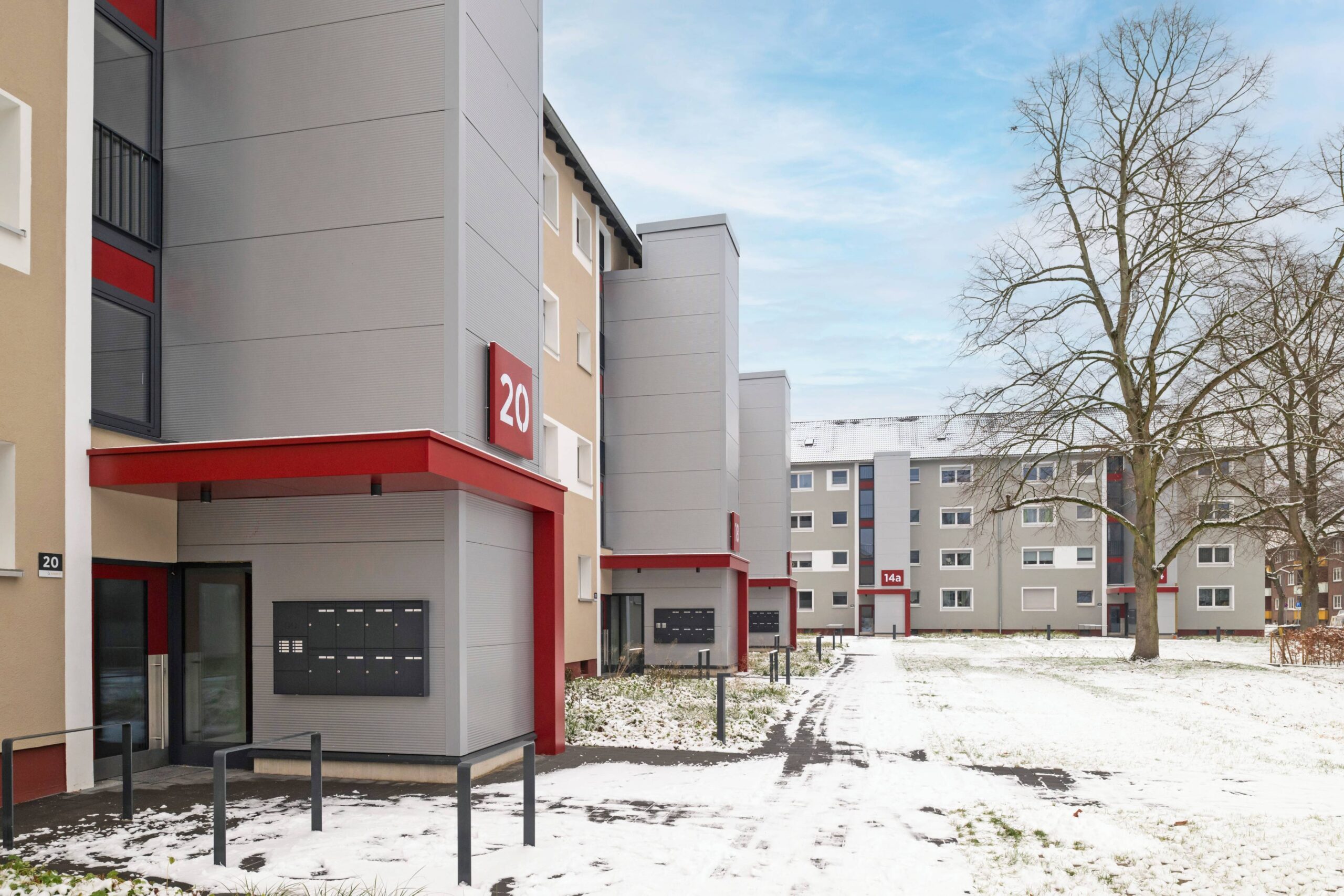 Im August 2023 ging es in den Bereichen Am Timpenkotten und Norpothstraße los. Dort wurden sukzessive 144 Wohnungen in 18 Mehrfamilienhäusern umfassend erneuert. Mittlerweile leuchten nicht nur die Fassaden in frischen und modernen Farben – auch die Wohnungen und Gebäude bieten mehr Komfort und eine deutlich verbesserte Energiebilanz.