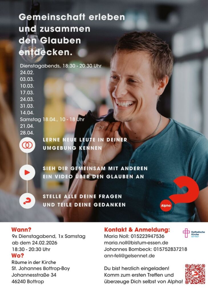 Die Pfarrei St. Cyriakus lädt ab Dienstag, 24. Februar zum mittlerweile dritten Alpha-Kurs ein. Dabei handelt es sich um eine Reihe von Treffen für alle Altersstufen, bei denen der christliche Glaube in entspannter und lockerer Atmosphäre entdeckt werden kann. Der Kurs gibt Raum für Fragen, Zweifel, Gedanken und neue Perspektiven im Glauben – ohne Druck und im Austausch miteinander.