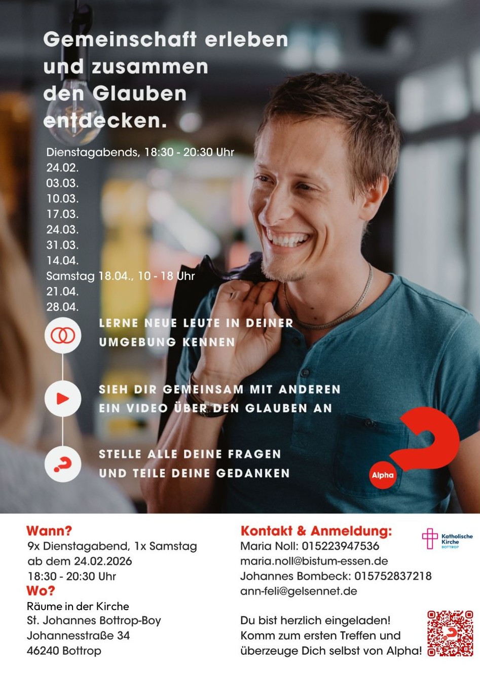 Weitere Informationen erhalten Interessierte bei Maria Noll (+49 1522 / 3947536, maria.noll@bistum-essen.de) oder bei Johannes Bombeck (+49 1575 / 2837218, ann-feli@gelsennet.de). Bei beiden Ansprechpartnern ist auch eine Anmeldung für den Kurs möglich.