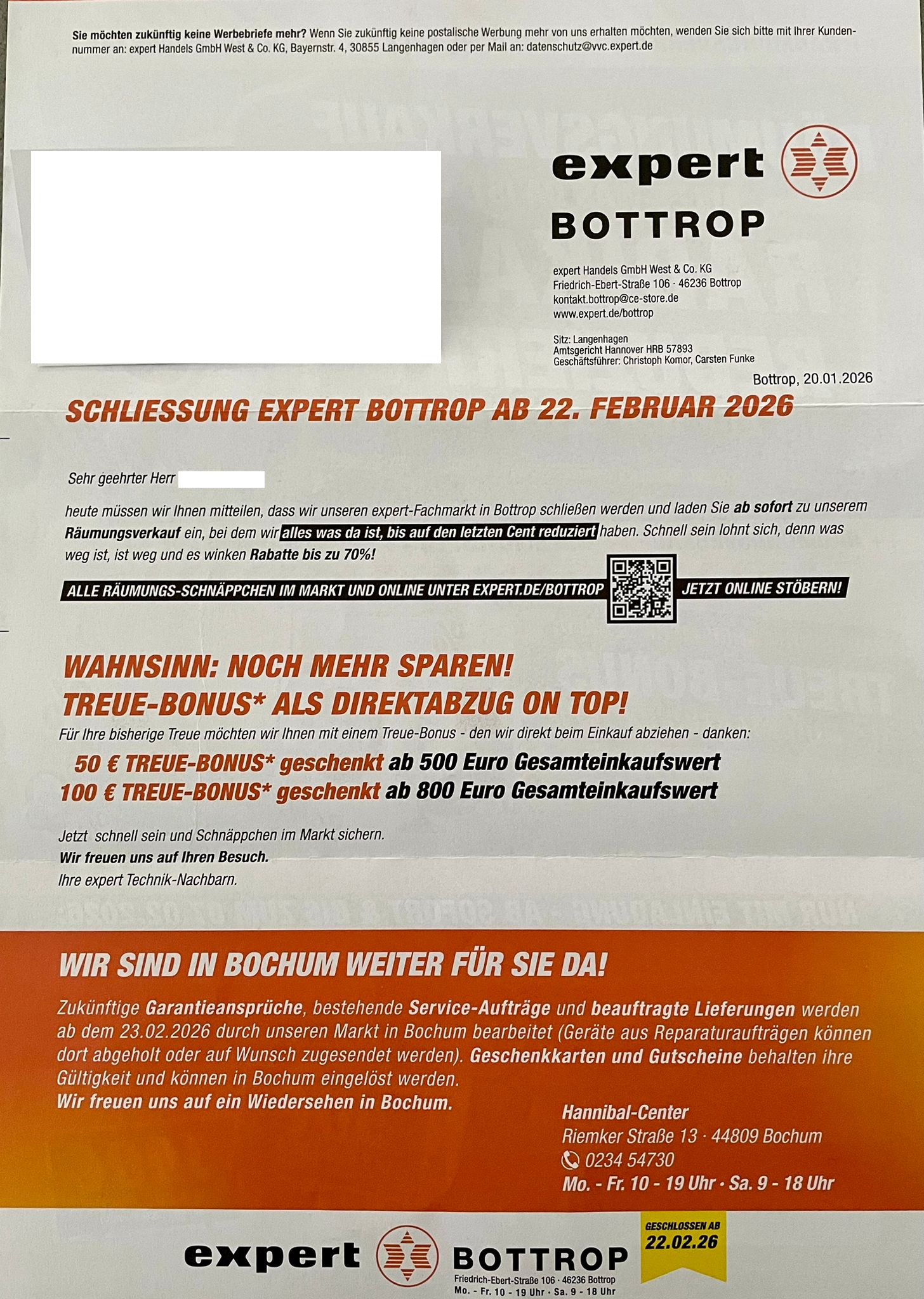“Heute müssen wir Ihnen mitteilen, dass wir unseren expert-Fachmarkt in Bottrop schließen werden und laden Sie ab sofort zu unserem Räumungsverkauf ein, bei dem wir alles was da ist, bis auf den letzten Cent reduziert haben. Schnell sein lohnt sich, denn was weg ist, ist weg und es winken Rabatte bis zu 70%”, heißt es in dem Brief, der sogar an Haushalte in umliegenden Städten verschickt wurde. Die Angebote können auch online durchgestöbert werden.