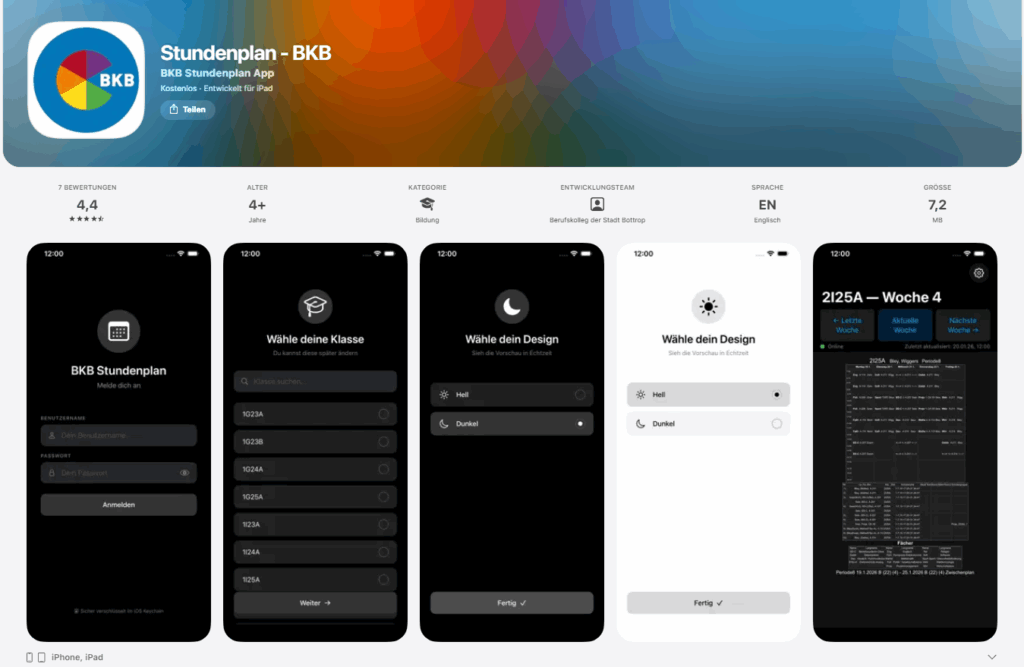 Die App mit dem Namen „Stundenplan BKB“ kann im App Store unter diesem Link heruntergeladen werden.