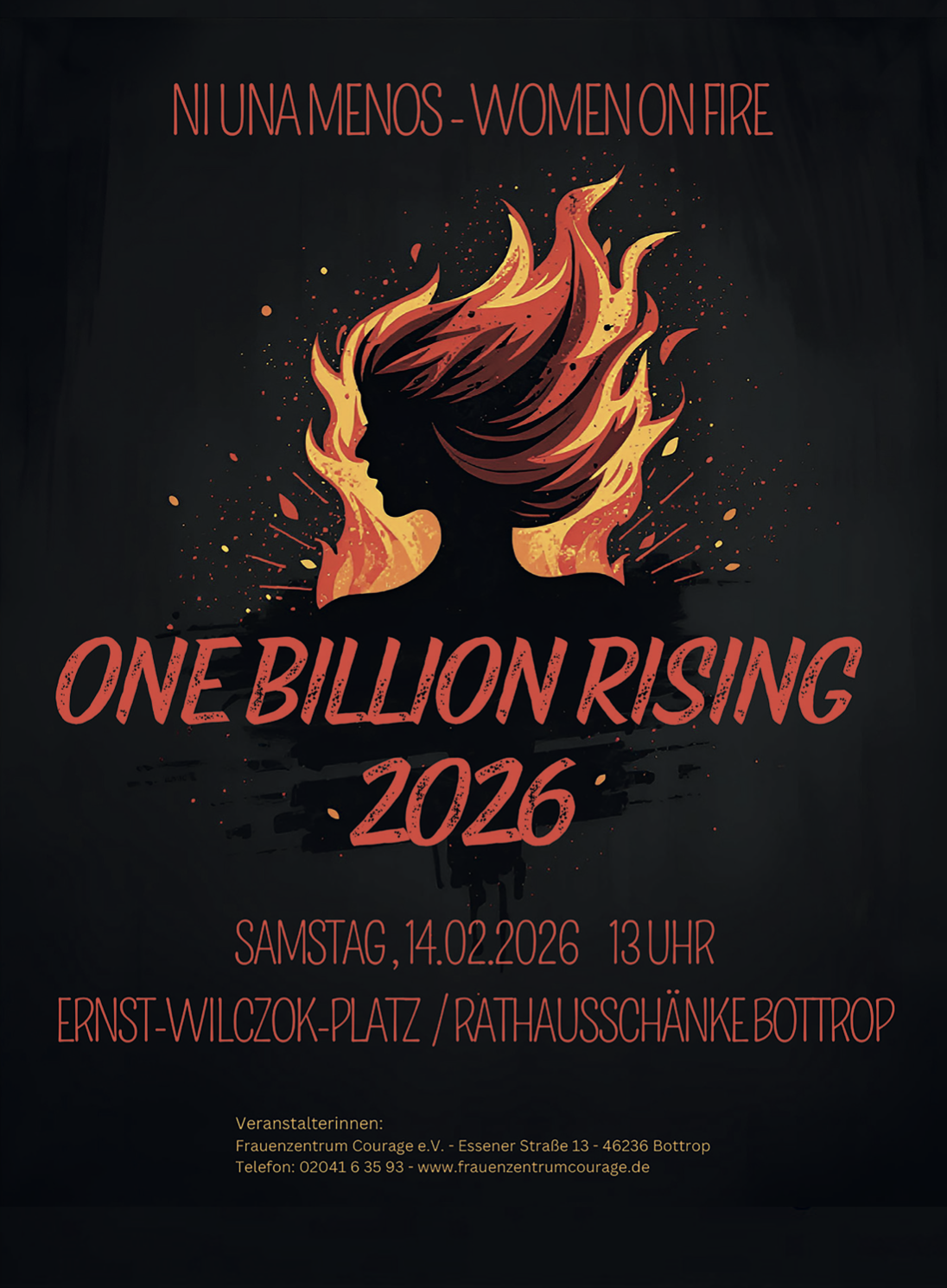 „Keine weitere Frau“ soll Opfer eines Femizides werden. Das ist die Bedeutung hinter den Worten: Ni una menos. Bereits seit 2016 organisiert das Frauenzentrum Courage zum 14.02. die Veranstaltung „One billion rising – Gegen Gewalt an Frauen und Mädchen“. An diesem Tag wird weltweit darauf aufmerksam gemacht, dass Frauen und Mädchen noch immer besonders häufig von häuslicher und sexualisierter Gewalt betroffen sind. Die Aktion hat das Ziel, das Bewusstsein in der Gesellschaft zu schärfen, die Solidarität mit Betroffenen zu fördern und gesellschaftliche Veränderungen zu fordern.