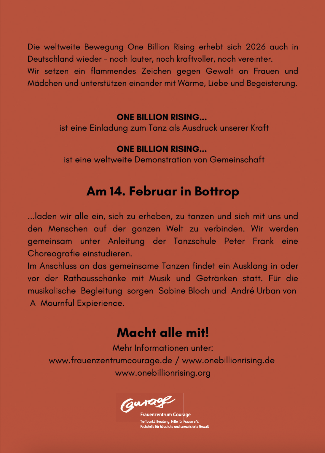 Am Samstag, 14.02.25 um 13.00 Uhr findet das Tanz- und Musikevent auf dem Rathausplatz/ Ernst-Wilczok Platz statt. Mit dabei ist die Tanzschule Peter Frank, die gemeinsam mit allen Anwesenden die Choreographie zu „Break the chain“ von Tena Clark einstudiert. Musikalisch wird die Aktion begleitet von Sabine Bloch und André Urban, zwei Bandmitglieder der Gruppe A Mournful Expierience. „Das Tanzevent ist eine wundervolle Form, um die gemeinsame Energie zu spüren und ist sehr ermutigend, nicht nur für Frauen und Mädchen, die selbst Gewalt erlebt haben!“, so die Mitarbeiterinnen des Frauenzentrums.