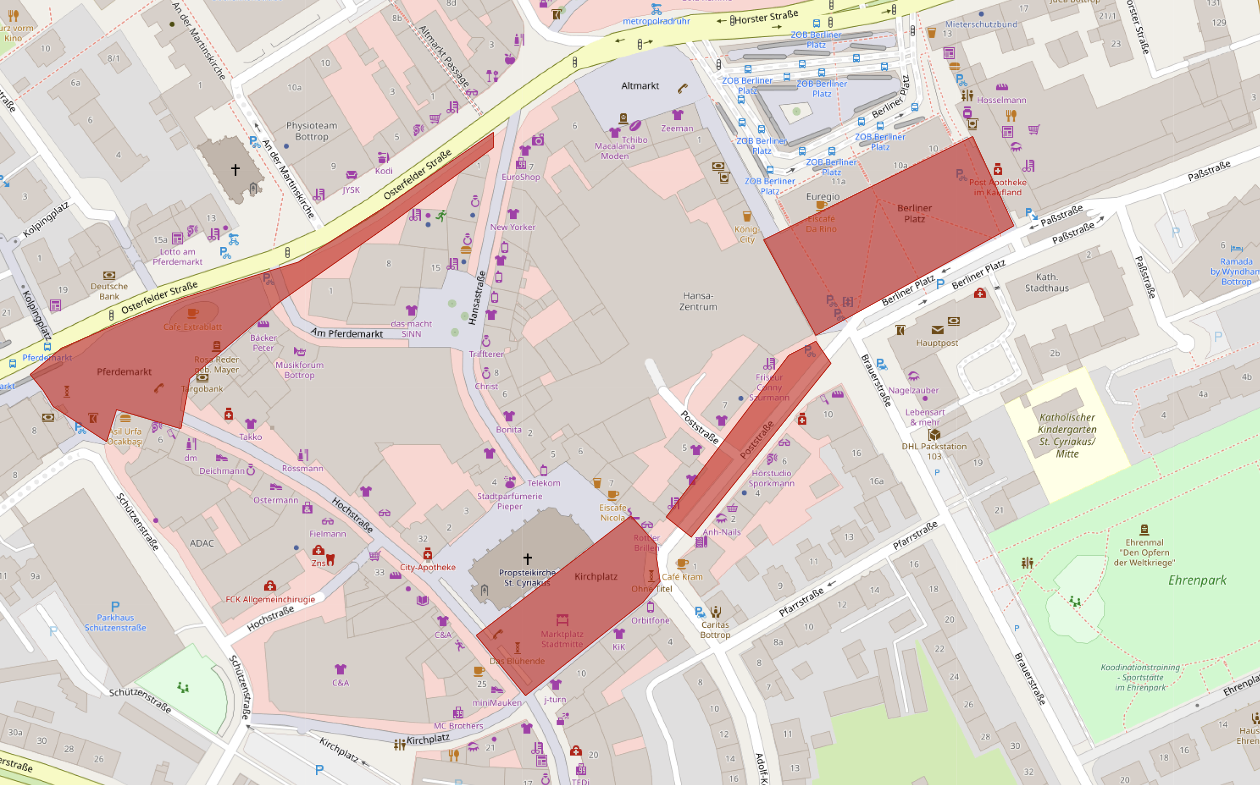 Die Kirmes zieht sich vom Pferdemarkt entlang des Gehwegs der Osterfelder Straße und findet auf dem Berliner Platz, dem Kirchplatz und der Poststraße statt.