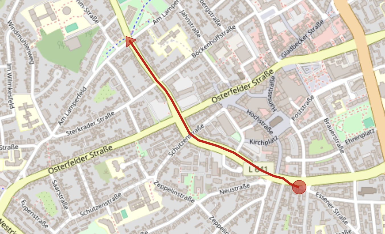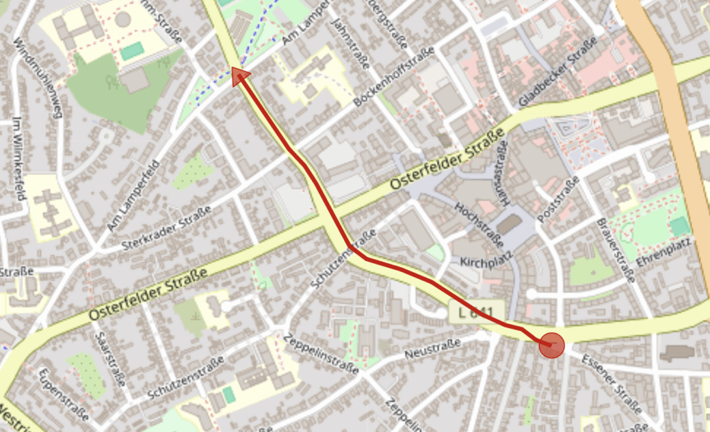 Der Zug stellt sich an der Essener Straße auf und führt dann über die Peterstraße und Hans-Böckler-Straße. Der Zug endet vor der Kreuzung ‘Am Lamperfeld’.