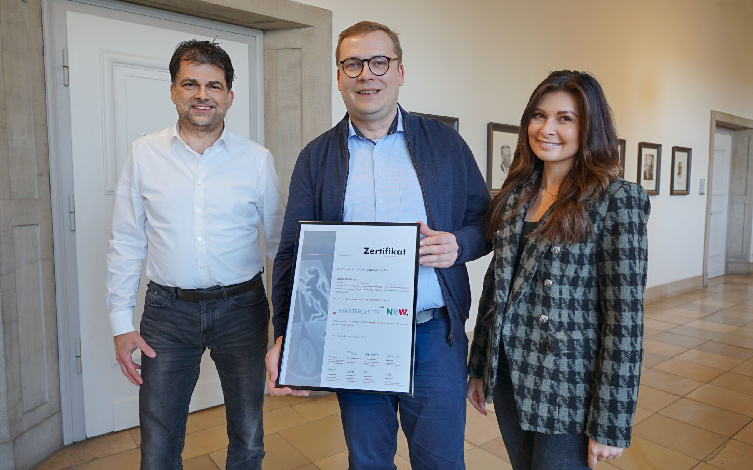 Das STARTERCENTER NRW mit Michael Liedmann (links) und Jelena Meyer Vicente wurde erneut zertifiziert. Oberbürgermeister Matthias Buschfeld überreicht die Urkunde.