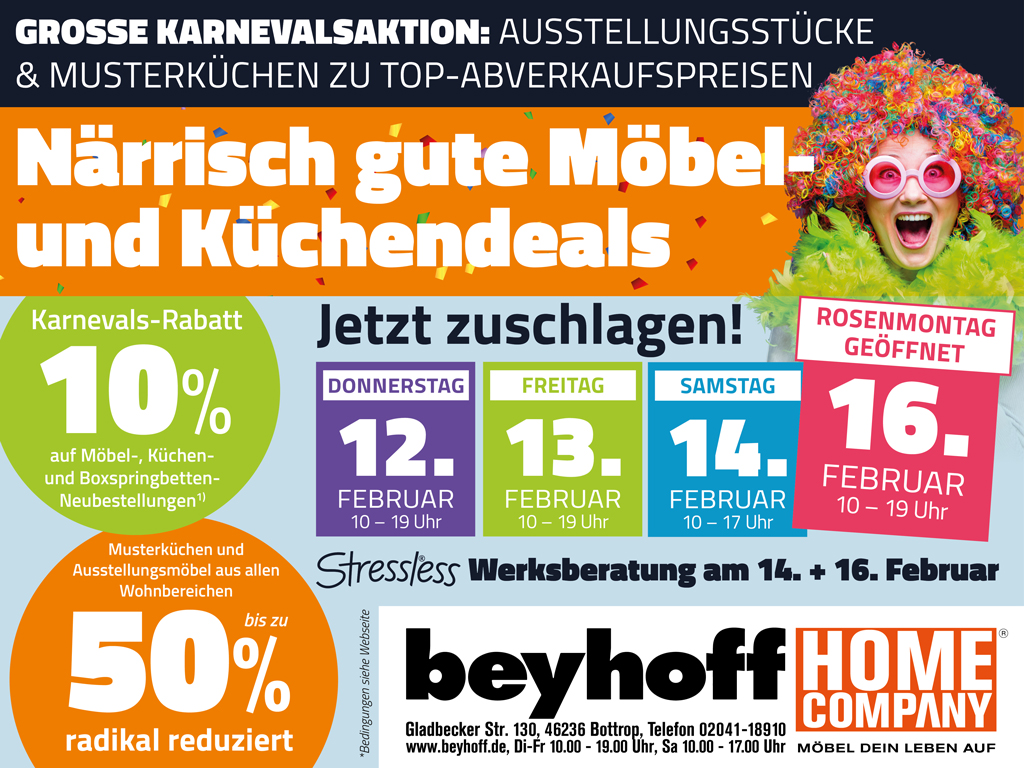 Pünktlich zur Karnevalszeit lädt das Bottroper Möbelhaus Beyhoff Home Company zu einer besonderen Verkaufsaktion ein: Unter dem Motto „Närrisch gute Möbel- und Küchendeals“ profitieren Kundinnen und Kunden von attraktiven Preisvorteilen auf Möbel und Küchen.