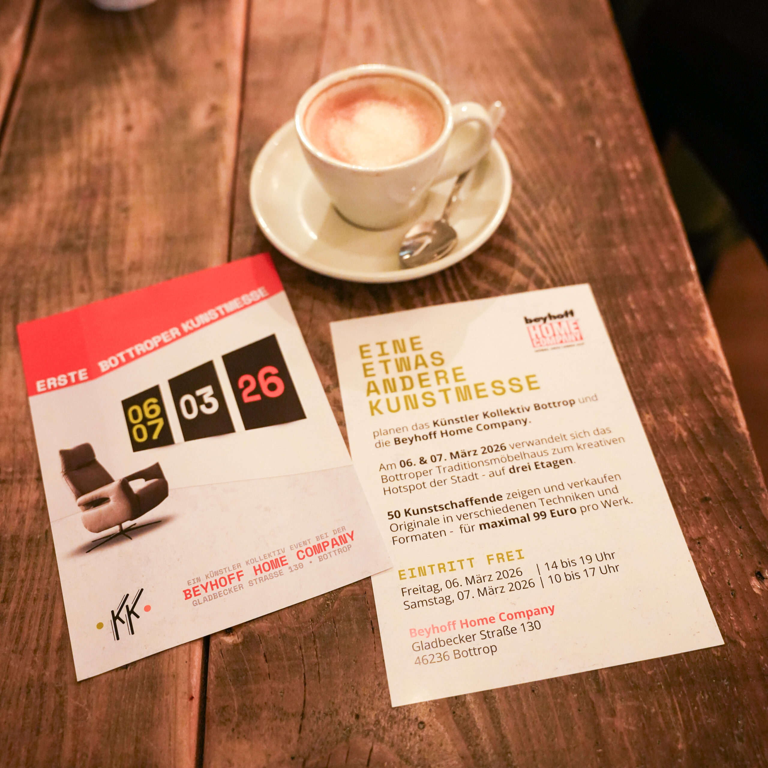 Neben der neuen Kunst im Café Kram hat das Künstler Kollektiv auch die nächste Aktion bereits geplant. Am 06. / 07. März wird die 1. Bottroper Kunstmesse in der Beyhoff Home Company stattfinden. Dort werden 50 Kunstschaffende zahlreiche Original-Kunstwerke und Drucke zum Kauf anbieten. Der Maximalpreis von 99 Euro gilt dabei für alle Werke, die an den Ständen der Künstlerinnen und Künstler gesehen werden können. Mehr Infos finden Interessierte in diesem Artikel: