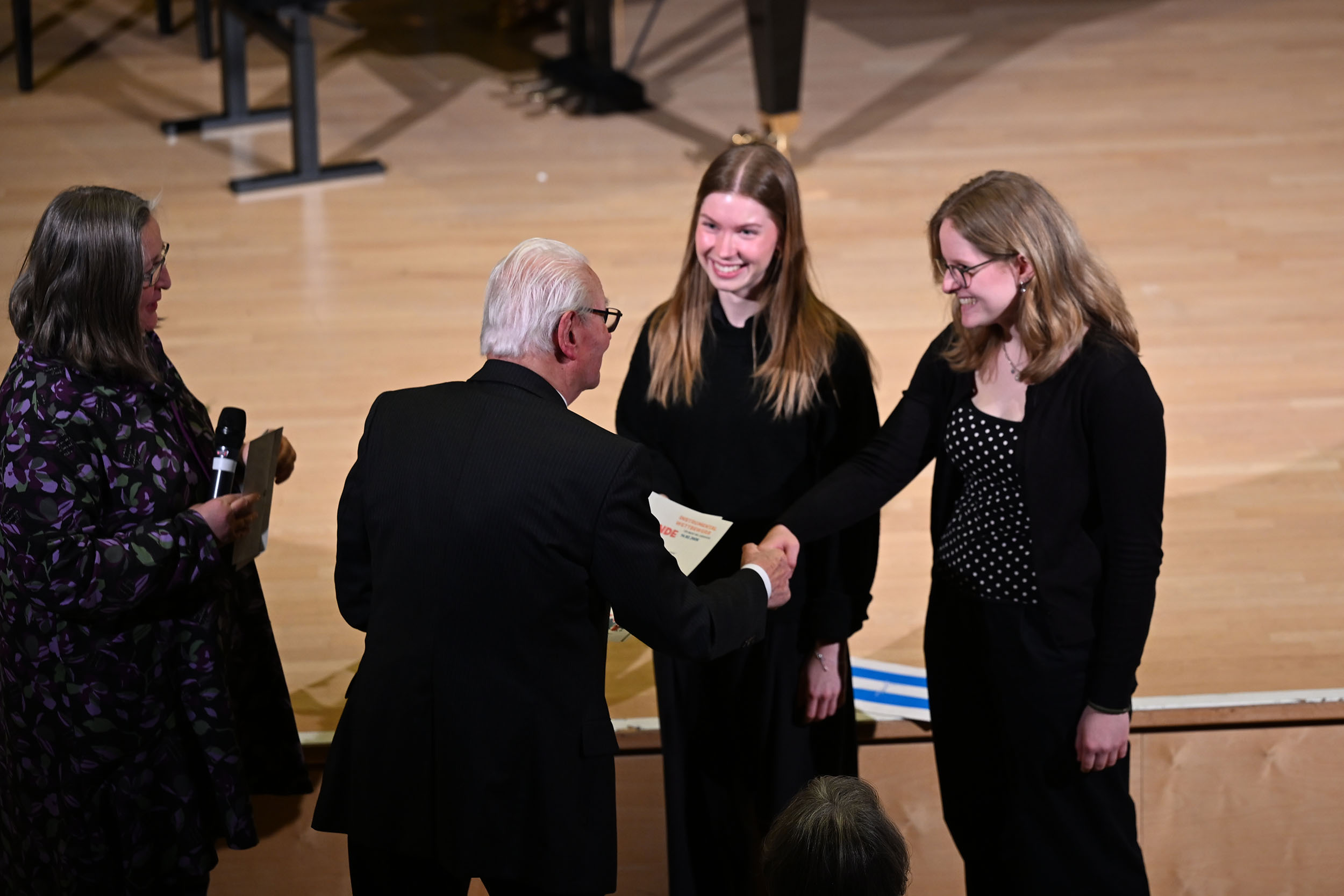 Darüber hinaus wurde im Rahmen der Preisverleihung auch der „Eberhard Bock Preis“ durch den Ehrenvorsitzenden des Fördervereins überreicht: Zum 10-jährigen Jubiläum des Fördervereins schenkte er der Musikschule einen Musikwettbewerb, der seinen Namen trägt und dessen ständige Preisgeldfinanzierung von der Volksbank gesichert ist. In diesem Jahr erhielten zum ersten Mal diesen Preis“ Linda Aretz und Nelly Balancik für ihr hervorragendes gemeinsames vierhändiges Klavierspiel.
