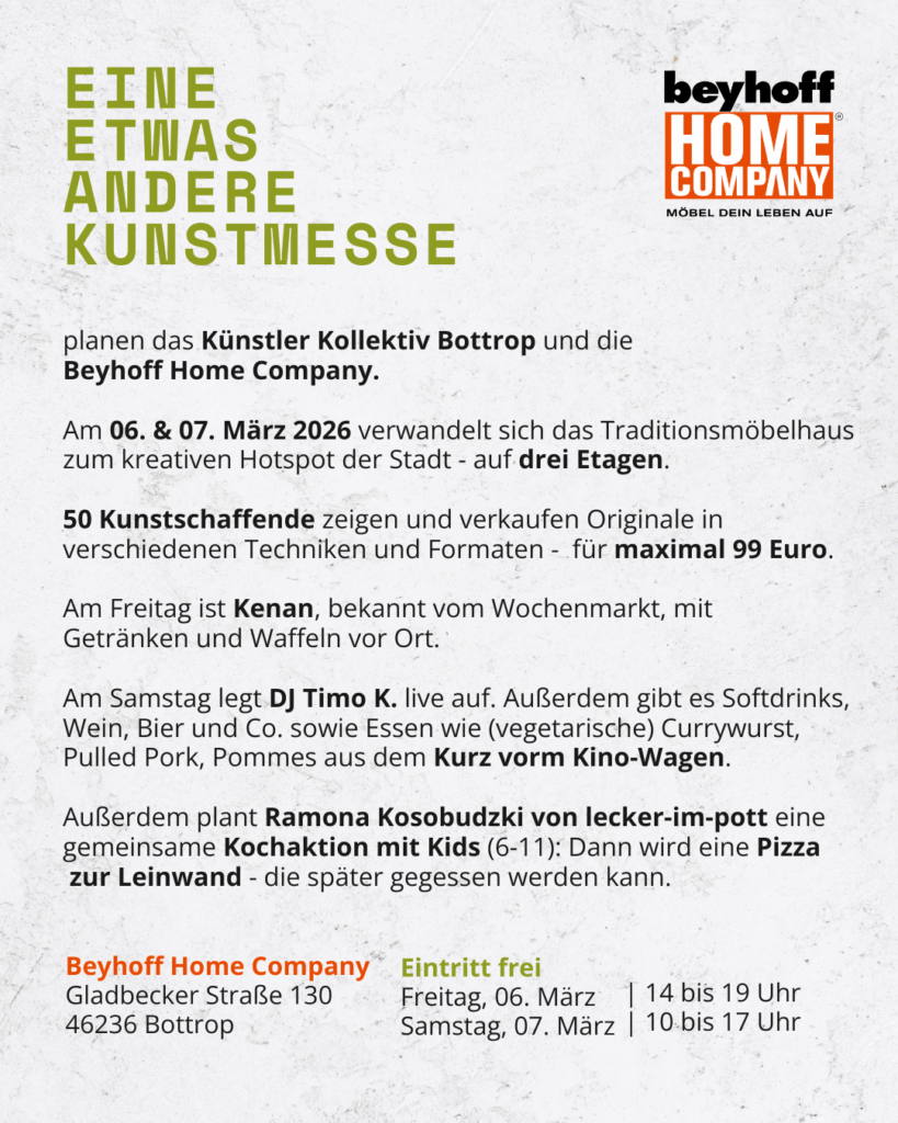 Eine Kunstmesse der “etwas anderen Art” plant das Künstler Kollektiv Bottrop am 06. & 07. März 2026 gemeinsam mit der Beyhoff Home Company.