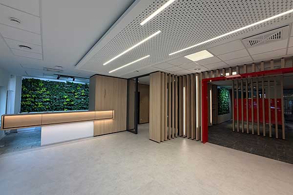 Mit einer siebenstelligen Investitionssumme bekennt sich die Sparkasse Bottrop langfristig zum Standort Im Fuhlenbrock. Dabei wurde nicht nur in das Design, sondern auch in die Infrastruktur investiert. Das Gebäude wurde energetisch saniert und sorgt nun mit einer modernen Wärmepumpe für einen klimafreundlichen Betrieb.