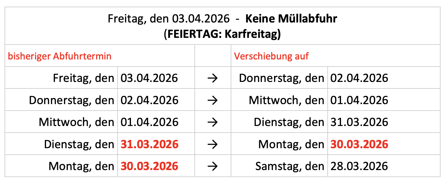 Aufgrund des Feiertages am 03. April 2026 verschiebt sich die Abfuhr der Abfalltonnen.