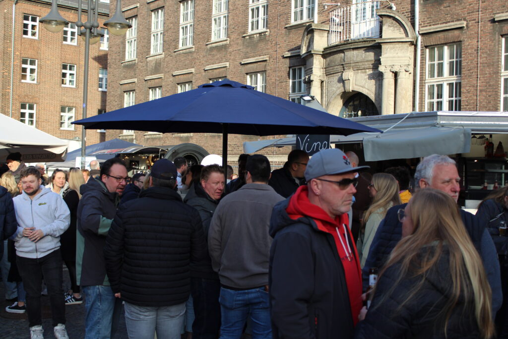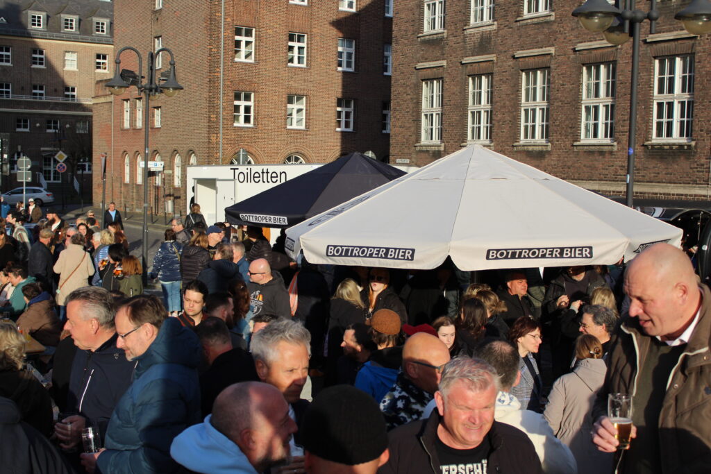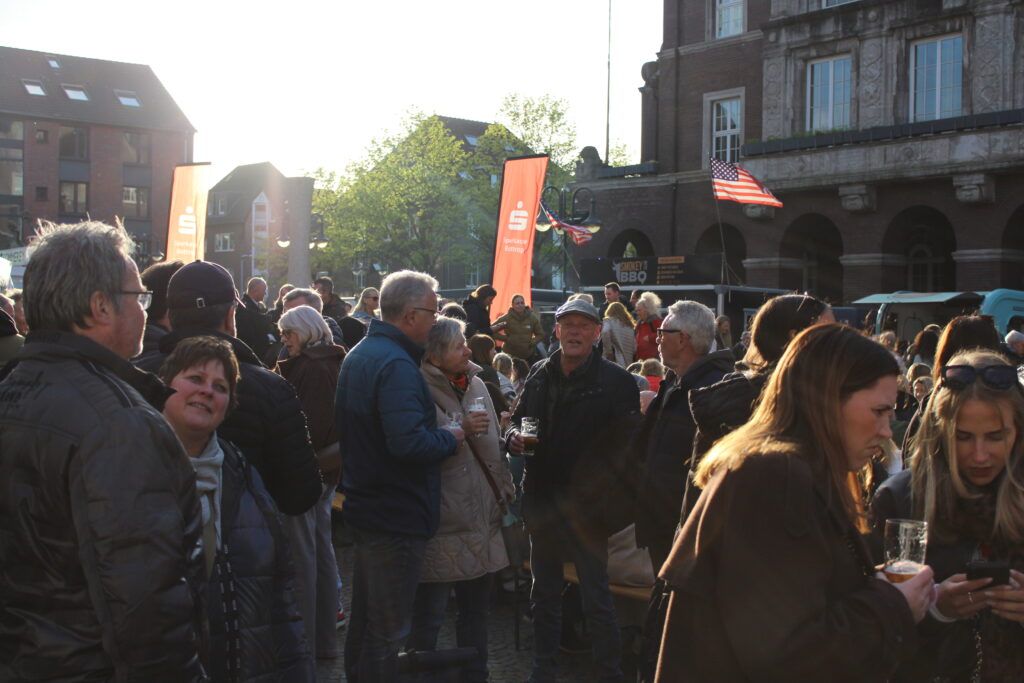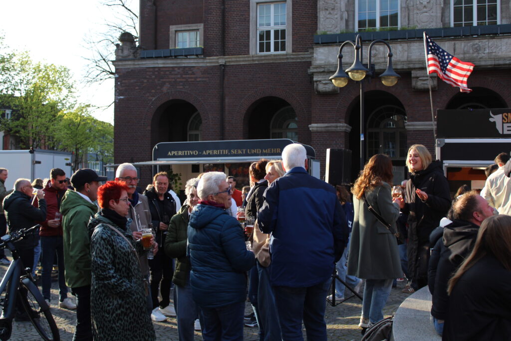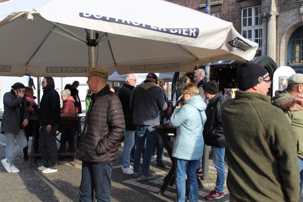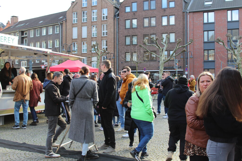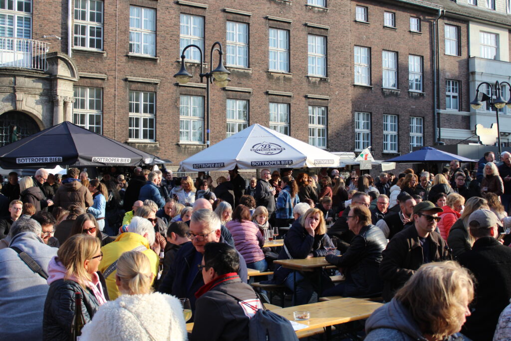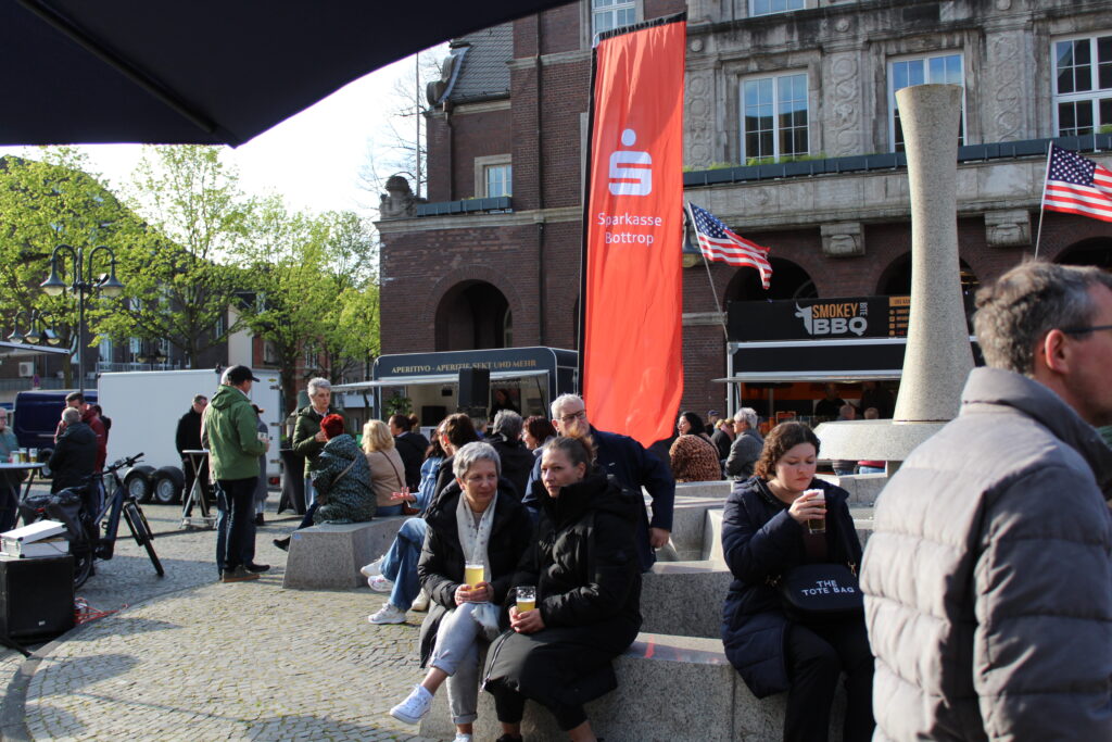 Hunderte Bottroperinnen und Bottroper, Sonnenschein und ein großes Gastro-Angebot, von Roastbeef-Sandwich über Döner-Pirroge bis Pommes-Currywurst – all das gab’s am Freitag, 10. April, auf dem Rathausplatz in Bottrops Innenstadt – beim Feierabendmarkt.
