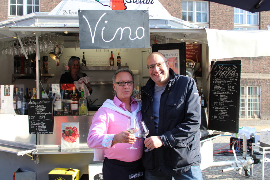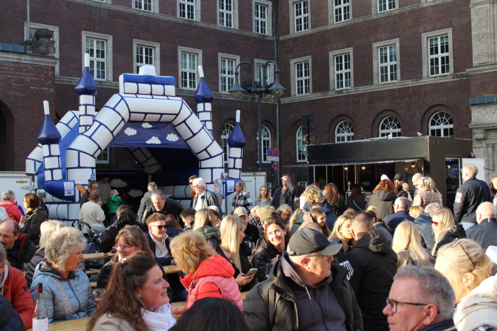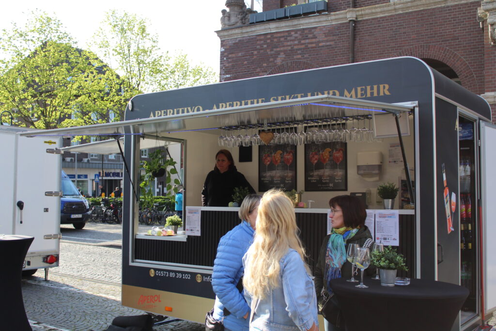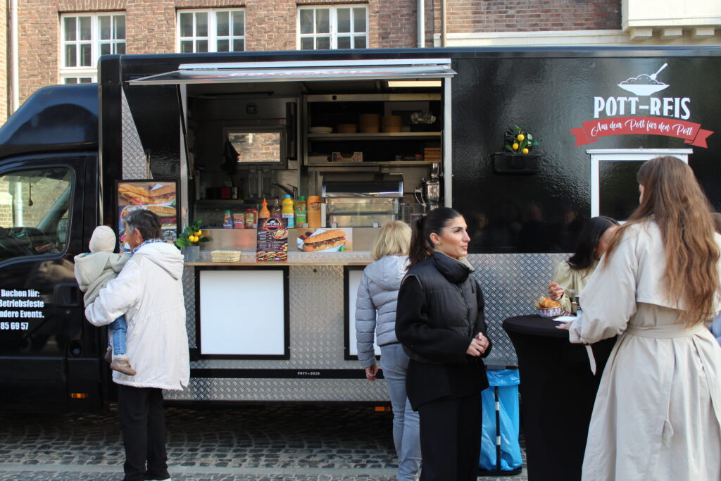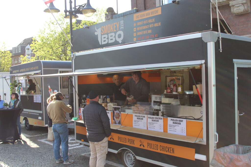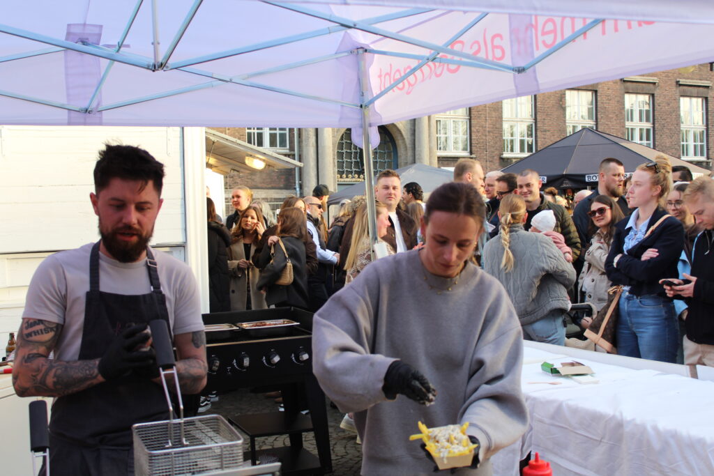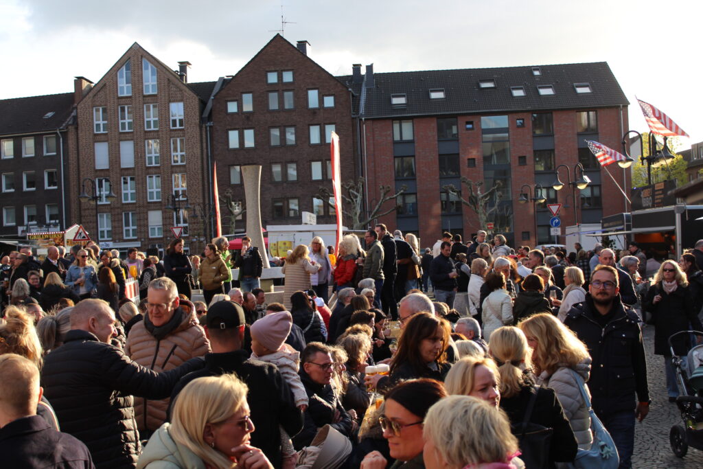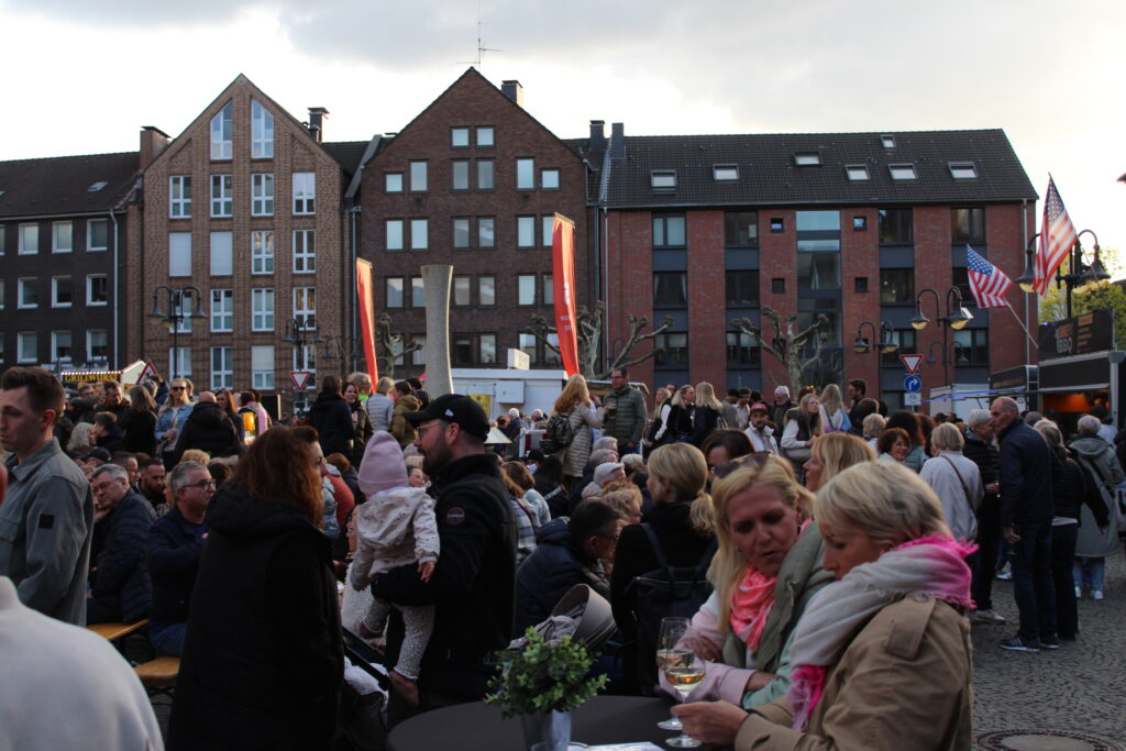 Hunderte Bottroperinnen und Bottroper, Sonnenschein und ein großes Gastro-Angebot, von Roastbeef-Sandwich über Döner-Pirroge bis Pommes-Currywurst – all das gab’s am Freitag, 10. April, auf dem Rathausplatz in Bottrops Innenstadt – beim Feierabendmarkt.