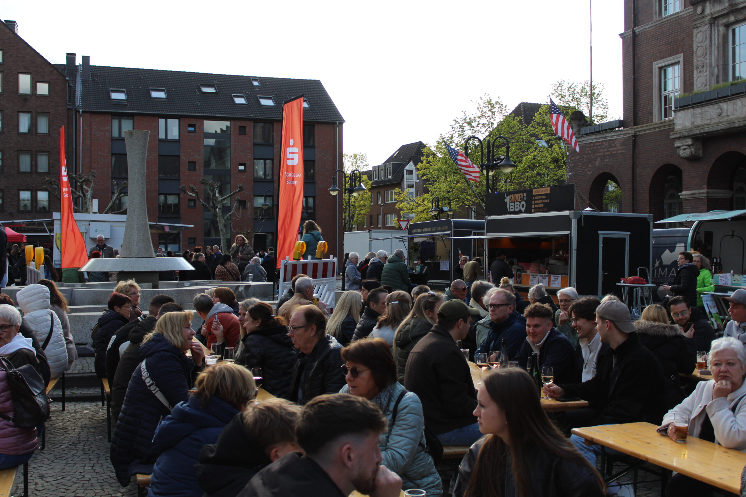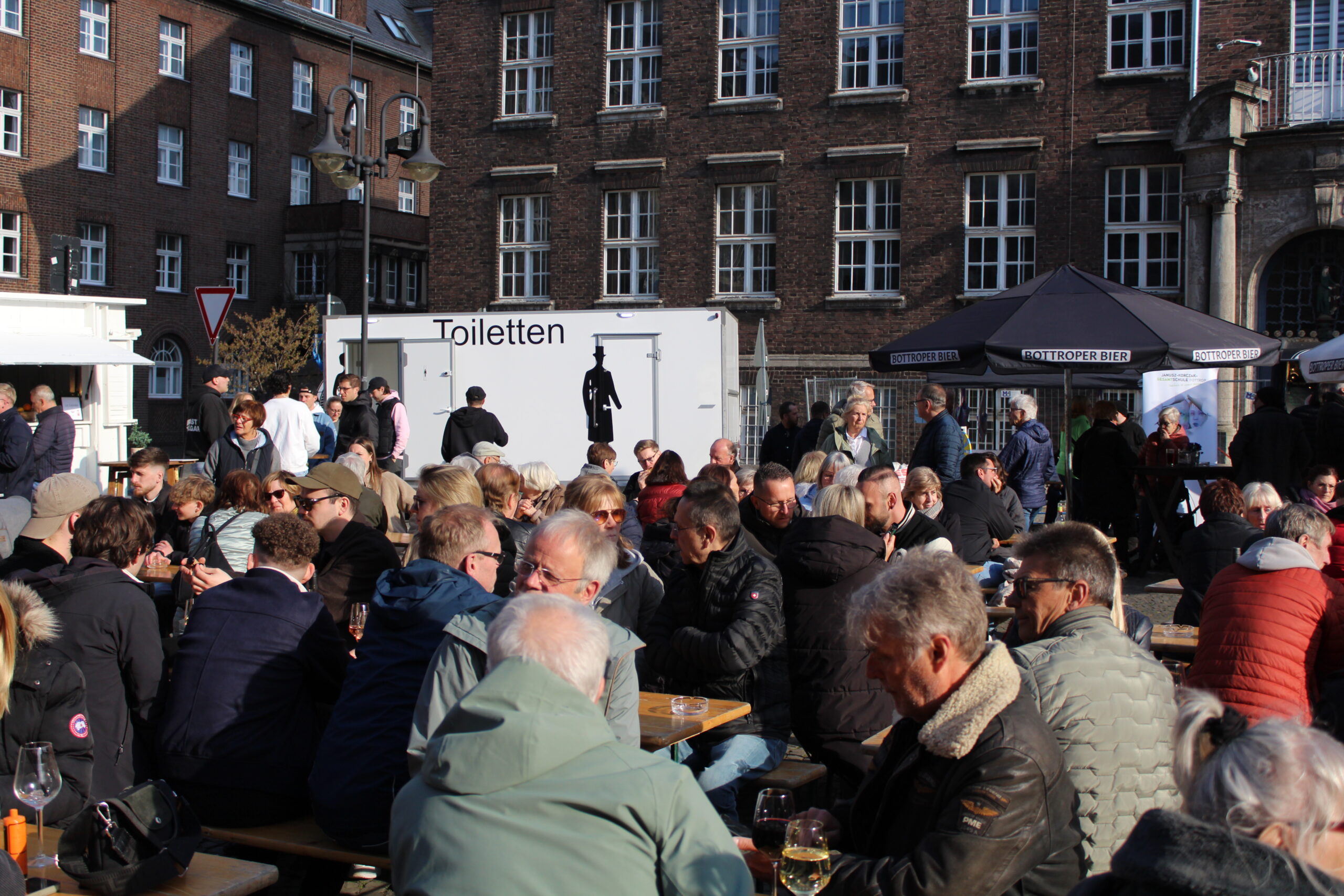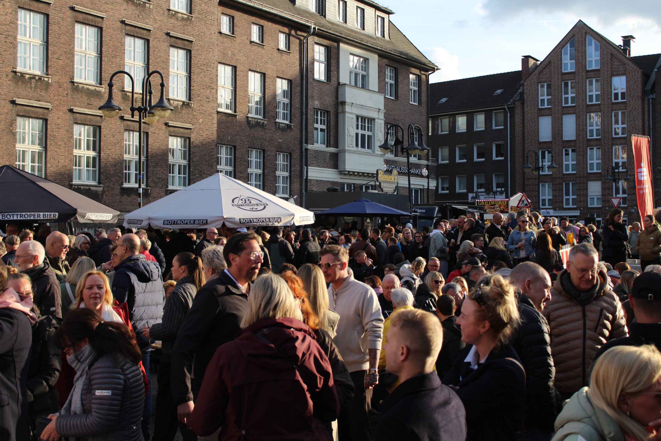 Hunderte Bottroperinnen und Bottroper, Sonnenschein und ein großes Gastro-Angebot, von Roastbeef-Sandwich über Döner-Pirroge bis Pommes-Currywurst – all das gab’s am Freitag, 10. April, auf dem Rathausplatz in Bottrops Innenstadt – beim Feierabendmarkt.