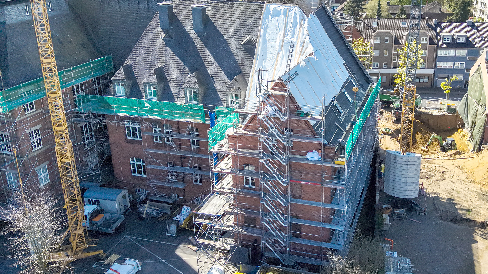Wegen der Arbeiten sind Teile des Parkplatzes gesperrt, weil sie für das Baugerüst, als Lagerfläche und für den Kran benötigt werden. Auf einer Fläche von mehr als 1.100 Quadratmeter – zuzüglich der Gauben – müssen die alten Schieferschindeln zunächst entfern und unter Umständen kleinere Reparaturen im Tragwerk durchgeführt werden. Danach werden die neuen Schiefer auf das Dach gebracht und dort mit handwerklicher Präzision angepasst. Zusätzlich wird auf dem Dach ein Blitzschutz installiert. Die Investitionssumme beträgt 770.000 Euro.