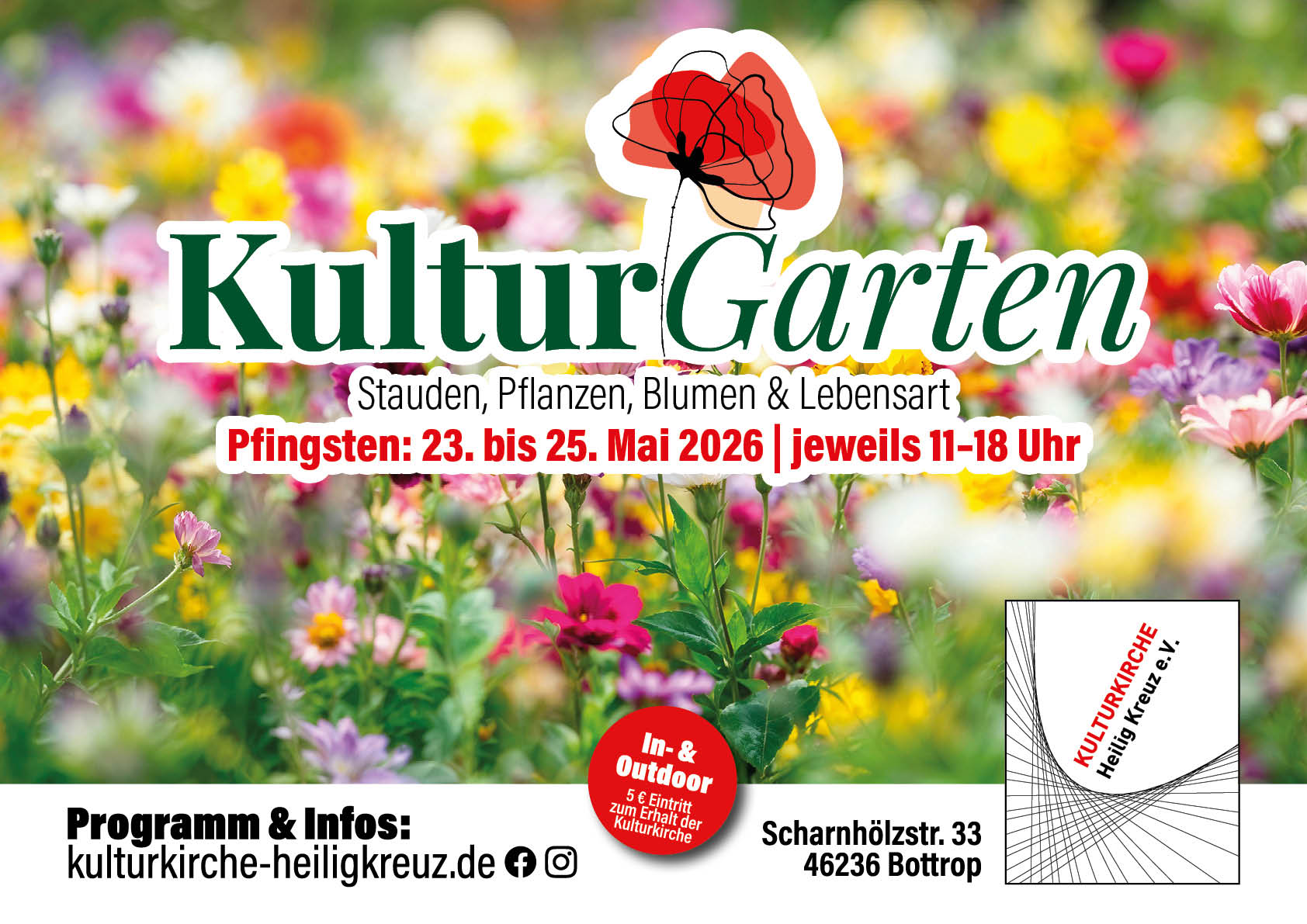 Der Pfingstmarkt „KulturGarten“ feiert vom 23. bis 25. Mai 2026 seine Premiere an der Kulturkirche Heilig Kreuz in Bottrop. An allen drei Tagen, von 11 bis 18 Uhr, verwandelt sich das Gelände der ehemaligen Kirche in eine farbenfrohe Mischung aus Gartenmarkt und Kulturfestival.