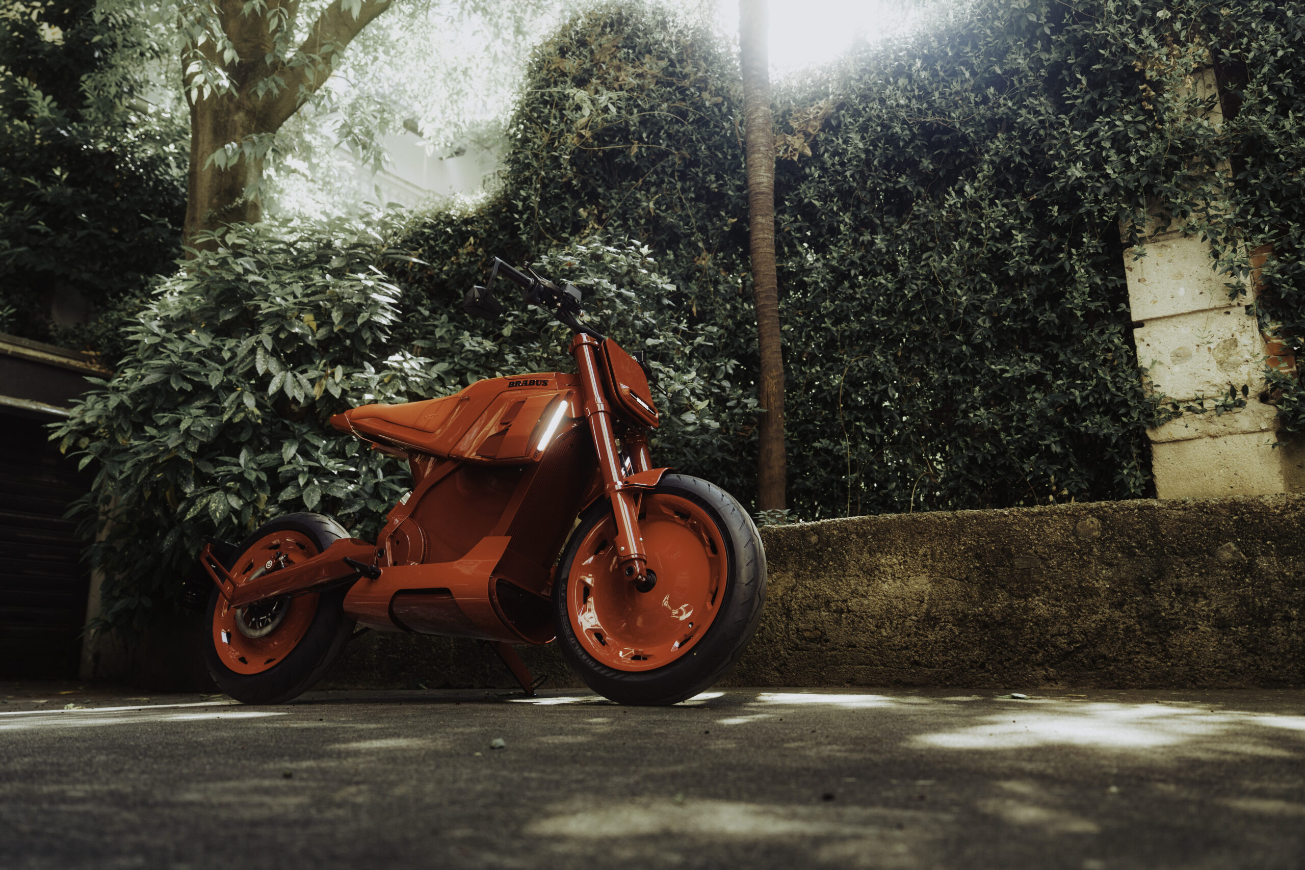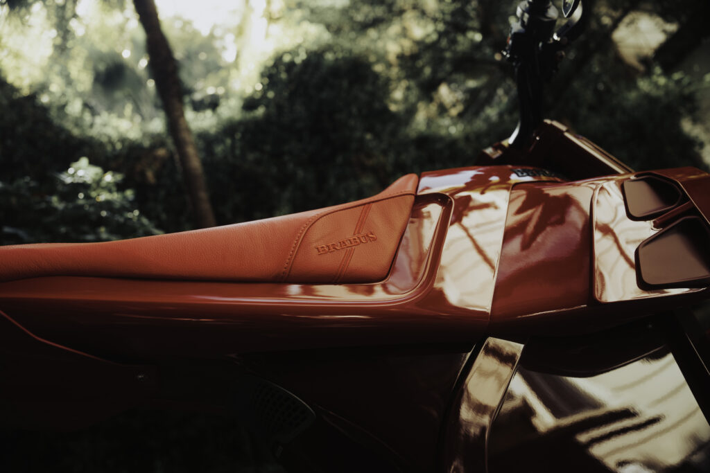 Das Erscheinungsbild wird auch maßgeblich durch die BRABUS „Tank“/Sitz-Verkleidung im Monocoque-Stil geprägt. In ihren links und rechts integrierten Hutzen sind neben den Lufteinlässen auch vertikale Tagfahrleuchten integriert. Zum exklusiven Auftritt gehören auch die hintere BRABUS-Radlaufabdeckung und ein BRABUS Cover für den vorderen Teil des Rahmens. Das vor dem Fahrersitz integrierte, aufklappbare Staufach bietet Platz für das Ladekabel.