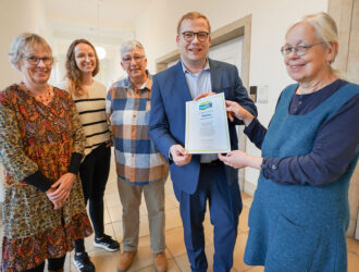 Anke Büker-Mamy (v.r.) überreicht das Fairtrade-Zertifikat an Oberbürgermeister Matthias Buschfeld. Zur Steuerungsgruppe gehören Nora Schrage-Schmücker,…