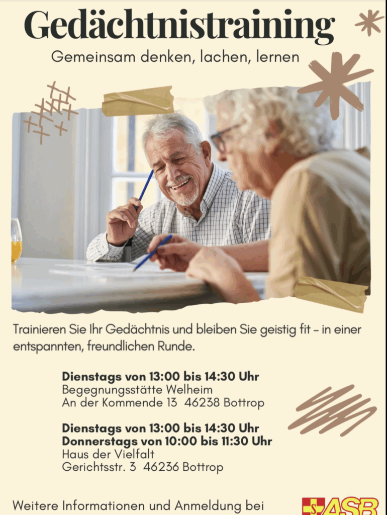 Geistig fit bleiben, Neues lernen und in netter Runde trainieren: Wir laden zum Gedächtnistraining in gemütlicher Runde ein. Mit Spielen, Übungen und kleinen Techniken trainieren wir gemeinsam Merkfähigkeit, Konzentration und Denkgeschwindigkeit.