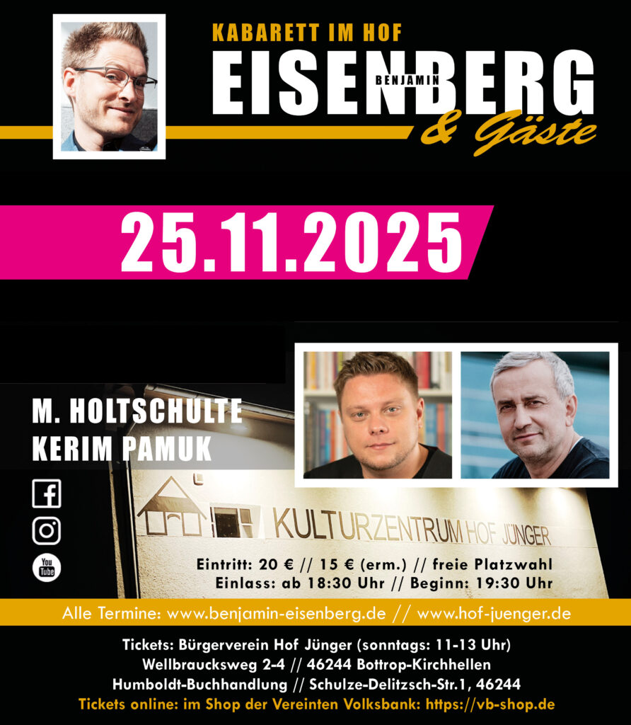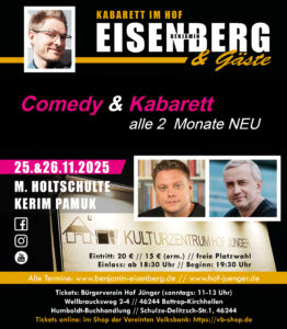 Kabarettist Benjamin Eisenberg präsentiert alle zwei Monate im Hof Jünger in Kirchhellen Gäste aus der Kleinkunstszene. Von Stand-up-Comedy über politisches wie musikalisches Kabarett ist alles dabei.