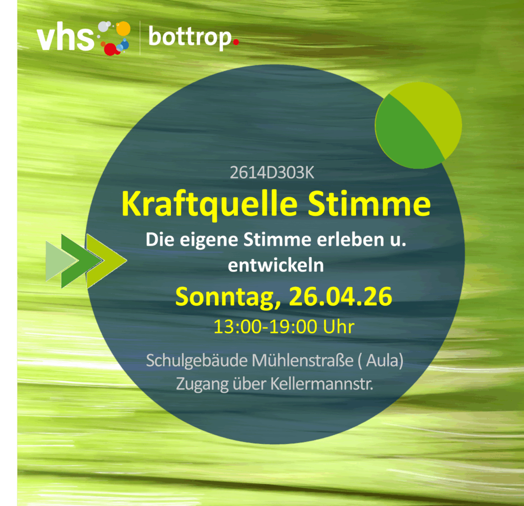 Web: https://www.vhs-bottrop.de/programm/gesundheit-bewegung/kw/bereich/kursdetails/kurs/2614C105B/kursname/KraftquelleStimme-DieeigeneStimmeerlebenundentwickeln/kategorie-id/301/