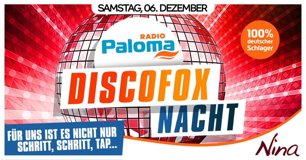 Am Samstag, den 06. Dezember, lädt das Tanzlokal NINA gemeinsam mit dem Radiosender „Radio Paloma“ erneut alle Discofox-Fans und Tanzbegeisterten ein, die Nacht zum Tag zu machen. Ab 21 Uhr wird zu deutschen Schlagern das Tanzbein geschwungen – und das bis tief in die Nacht!