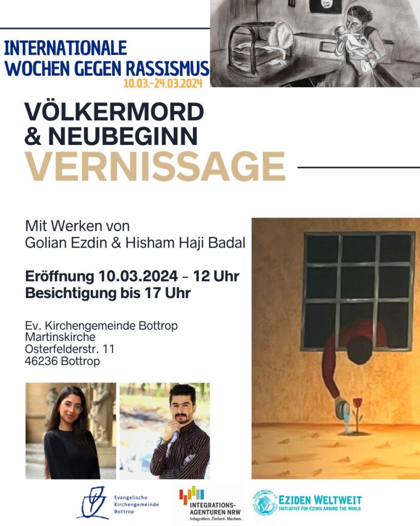 Im Zuge der Internationalen Wochen gegen Rassismus wird die Ausstellung “Völkermord & Neubeginn” mit Werken von Golian Ezdin & Hisham Haji Badal vom 10. bis 24. März 2024 in der Martinskirche Bottrop präsentiert. Weitere Öffnungstage findest Du in unserem Veranstaltungskalender.