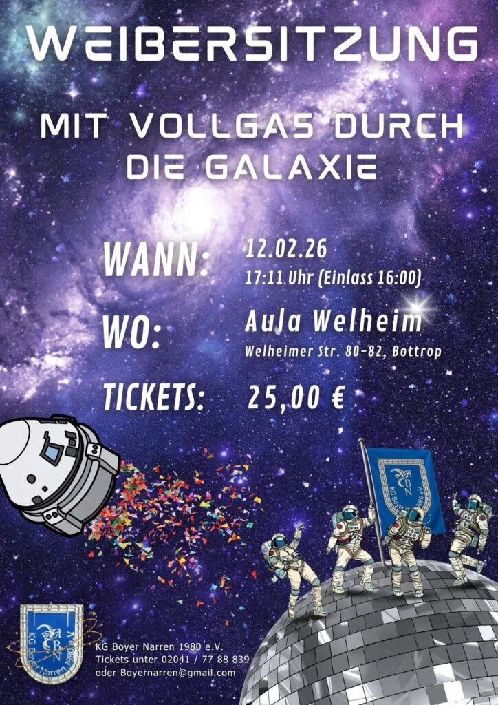 (c) Grafik: KG Boyer Narren/Facebook Datum: 12.02.2026 Beginnt um: 17:11 Endet um: Location: Aula Welheim, Welheimer Straße 80-82, 46238 Bottrop Eintritt: ausverkauft Web:
